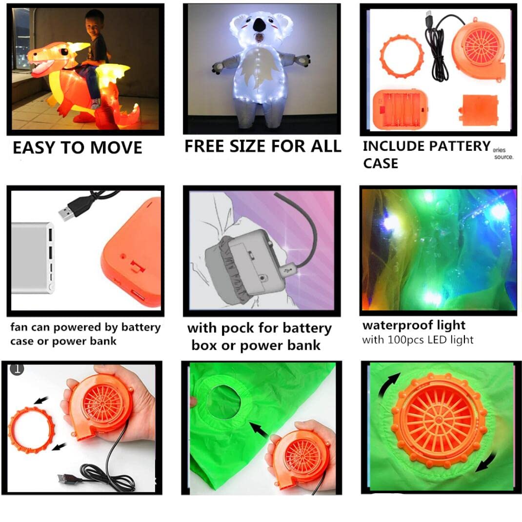- Q: How do you inflate the costume? A: To inflate the costume, simply put it on and turn on the fan switch, allowing it to inflate quickly. The fabric is strong yet lightweight, making it easy to wear.