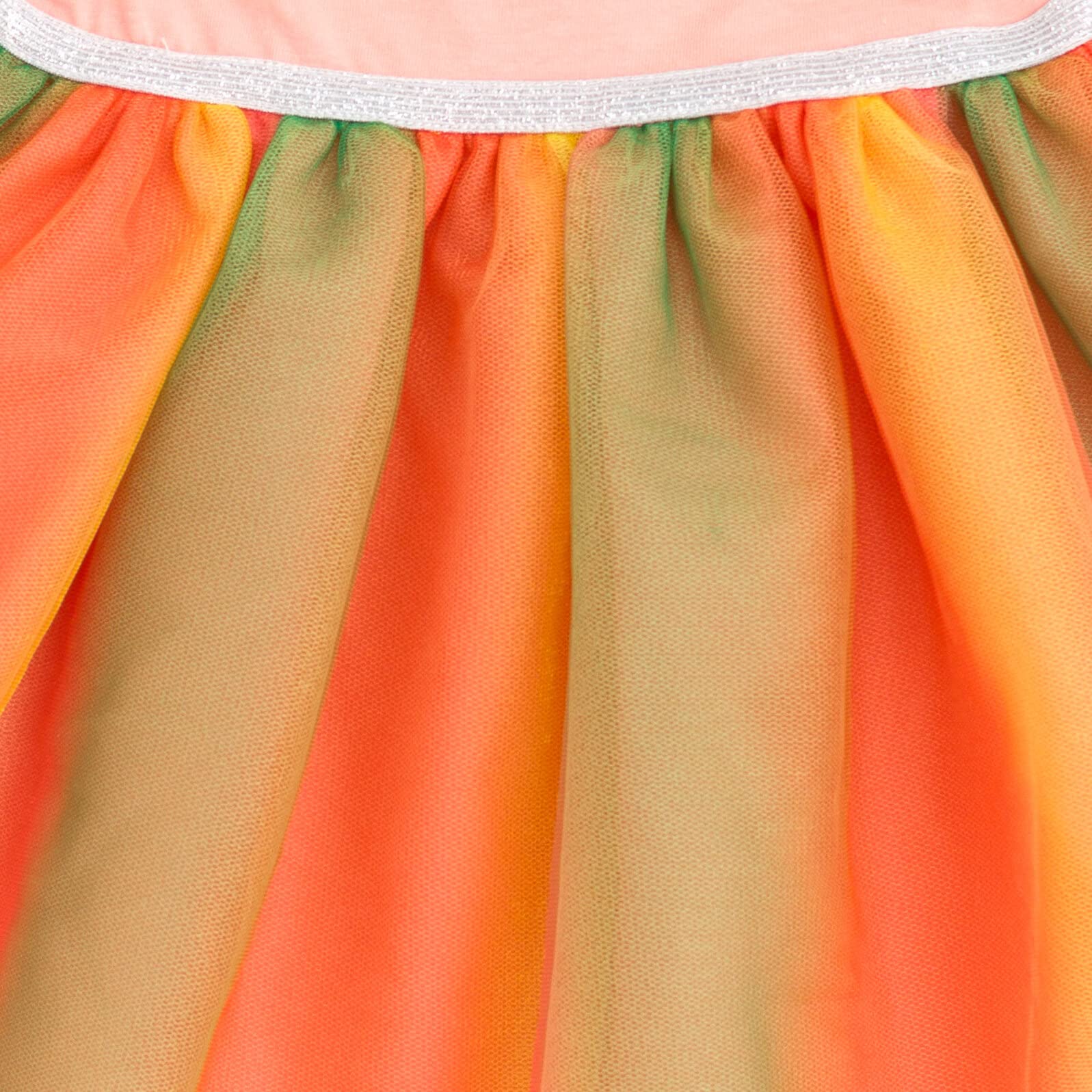 - Q: Does this dress have any special features? A: Yes, the dress features a tulle skirt, rib knit crew neck collar, stylish ruffles at the shoulders, and a soft hand screen print design with glitter.