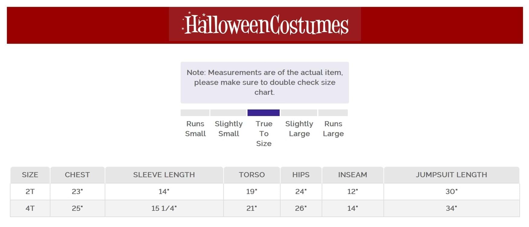 - Q: How does the sizing of this costume compare to standard clothing sizes? A: The 4T size of this costume corresponds to a typical toddler size and includes measurements such as chest of 25 inches, sleeve length of 15.25 inches, torso of 21 inches, hips of 26 inches, inseam of 14 inches, and a jumpsuit length of 34 inches.