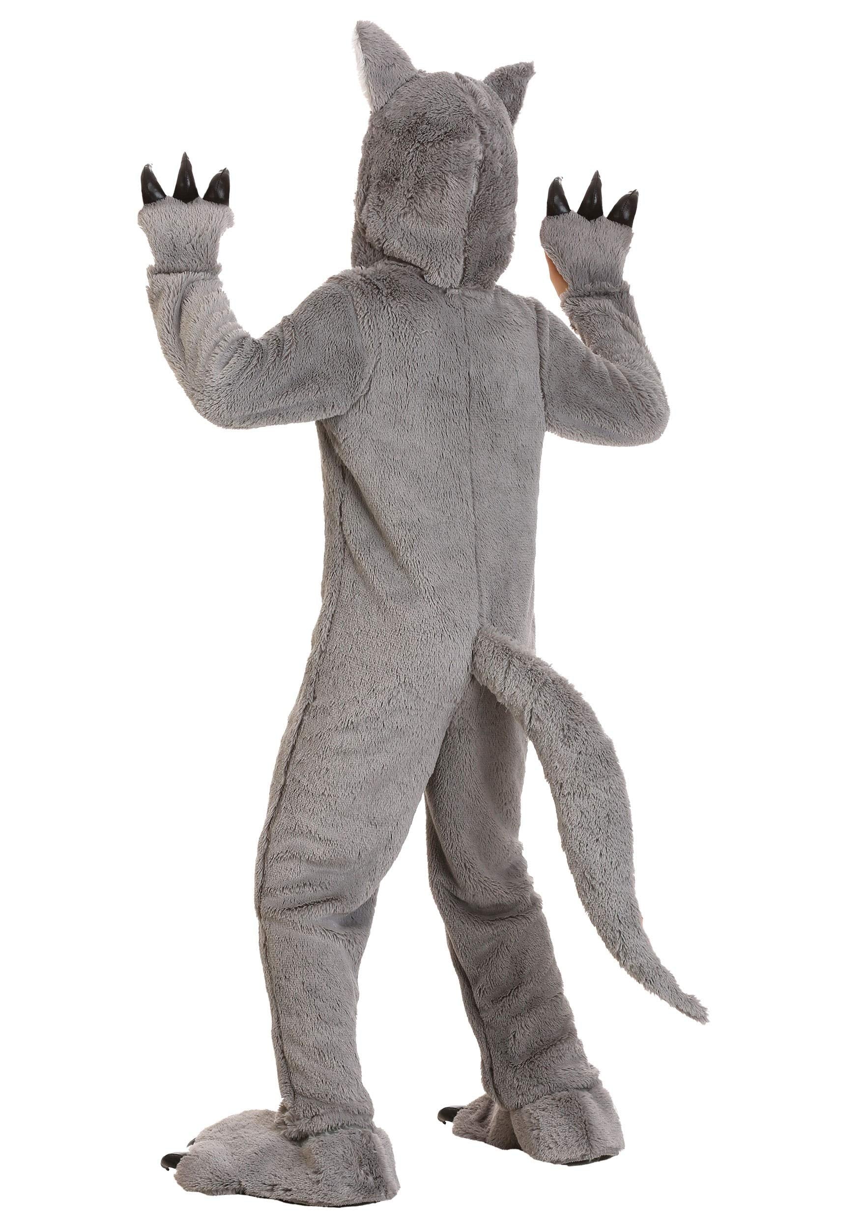 - Q: What features does this costume include? A: This costume features a full-body jumpsuit with a front zipper, a stuffed wolf tail, an embroidered hood with wolf face details, attached mitts with stuffed claws, and separate shoe covers with plush claws.