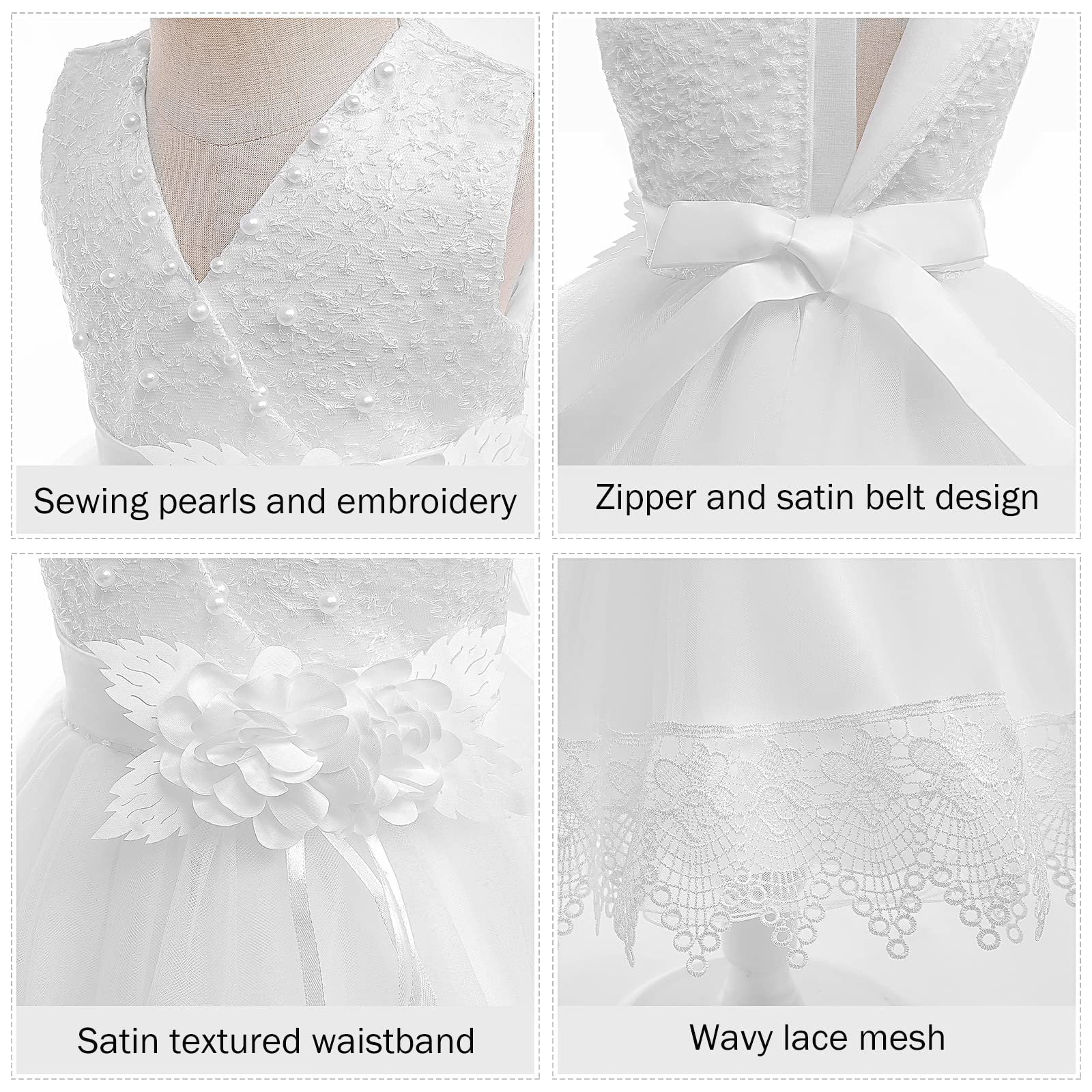 - Q: What features make this dress unique? A: The dress features a unique design with both round and V necklines, a back zipper, lace flower ruffle prints, and a waist bow for added charm.