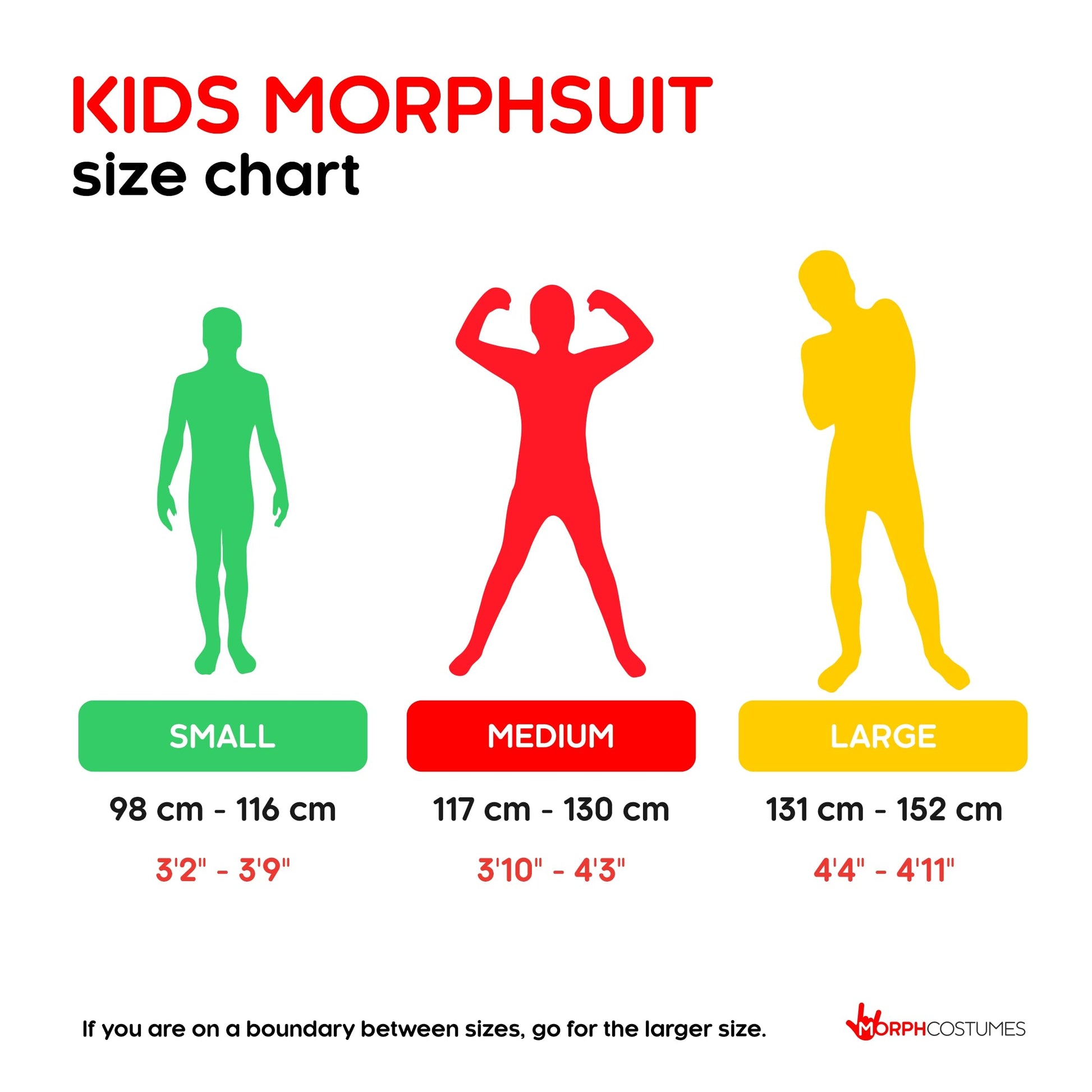 - Q: What sizes are available for the Morphsuits Kids Black Bodysuit Costume? A: The Morphsuits Kids Black Bodysuit Costume is available in three sizes: Small, Medium, and Large. Please refer to the size chart image for detailed sizing information based on height.