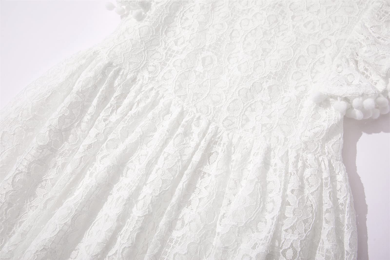 - Q: What are the unique design features of this dress? A: The dress features quality lace layers with a delicate hollowed pattern, ruffles around the neck, and pom pom details on the sleeves and bottom.