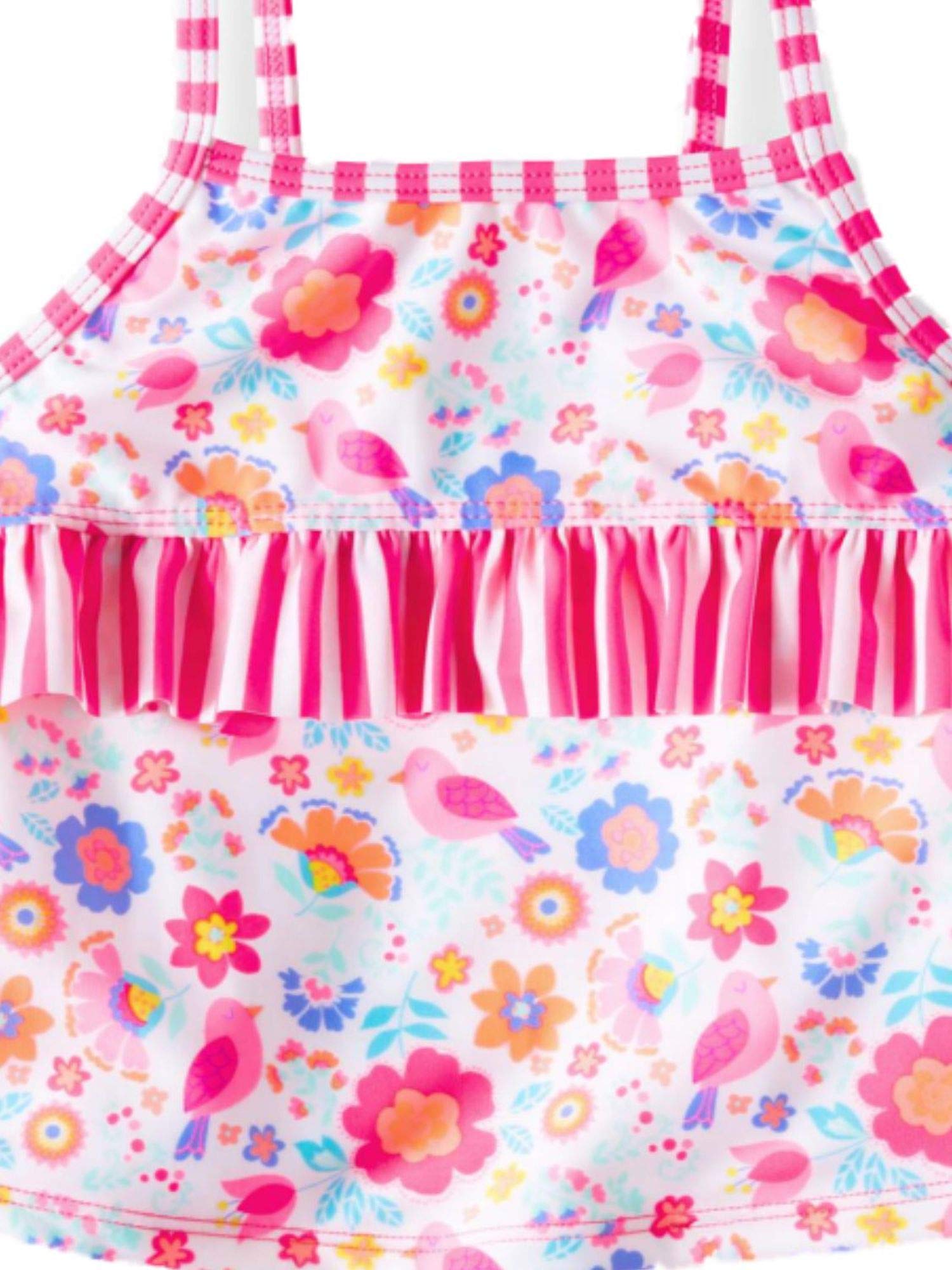 - Q: What is included in the Toddler Girls Pink Sizzle Floral Tankini Swimsuit? A: The Toddler Girls Pink Sizzle Floral Tankini Swimsuit includes a two-piece set featuring a ruffled tankini top and matching bottoms.