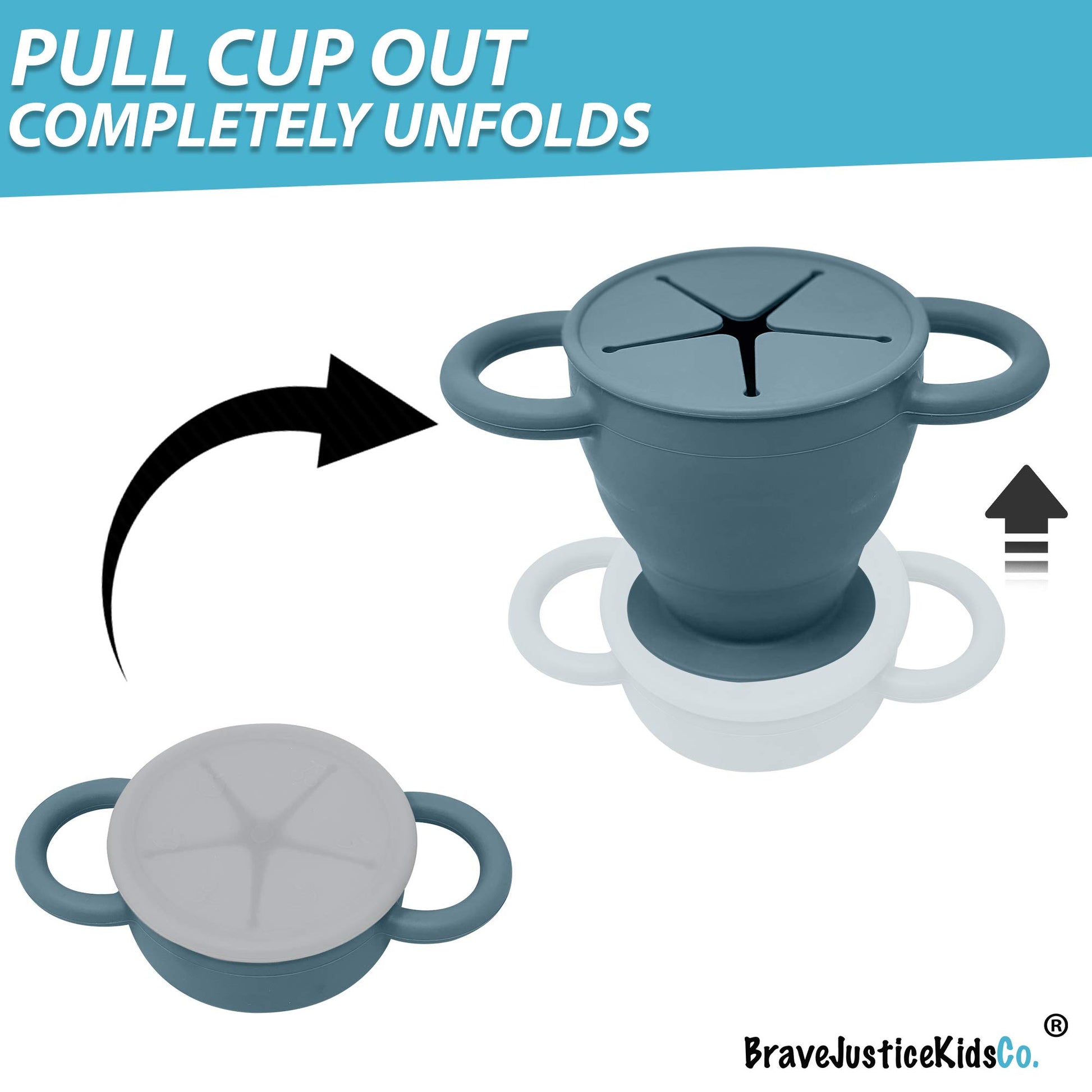Versatile, durable toddler snack cup with Space Saving Technology and No Mess snack catcher lid technology. A new snack cup for the 21st century lifestyle. The only collapsible snack cup on the market that you will need. Are you a mom that wants to give your baby a snack on the go and not worry about it spilling all over your couch, in the stroller, or those brand new leather car seats? Do you cherish every little bit of space you have in your diaper bag/backpack? Do you hate the frustrations when your childs hand cant reach all the snacks at the bottom, or their hand gets stuck inside of the container because of the hard plastic? Dont worry about a mess with these handy space saving snack cups. You can have confidence that your babys snacks wont spill, that you can save space with the collapsible silicone technology, and that you can collapse/fold it down to one level so your childs hand can safely reach all the yummy snacks at the bottom.