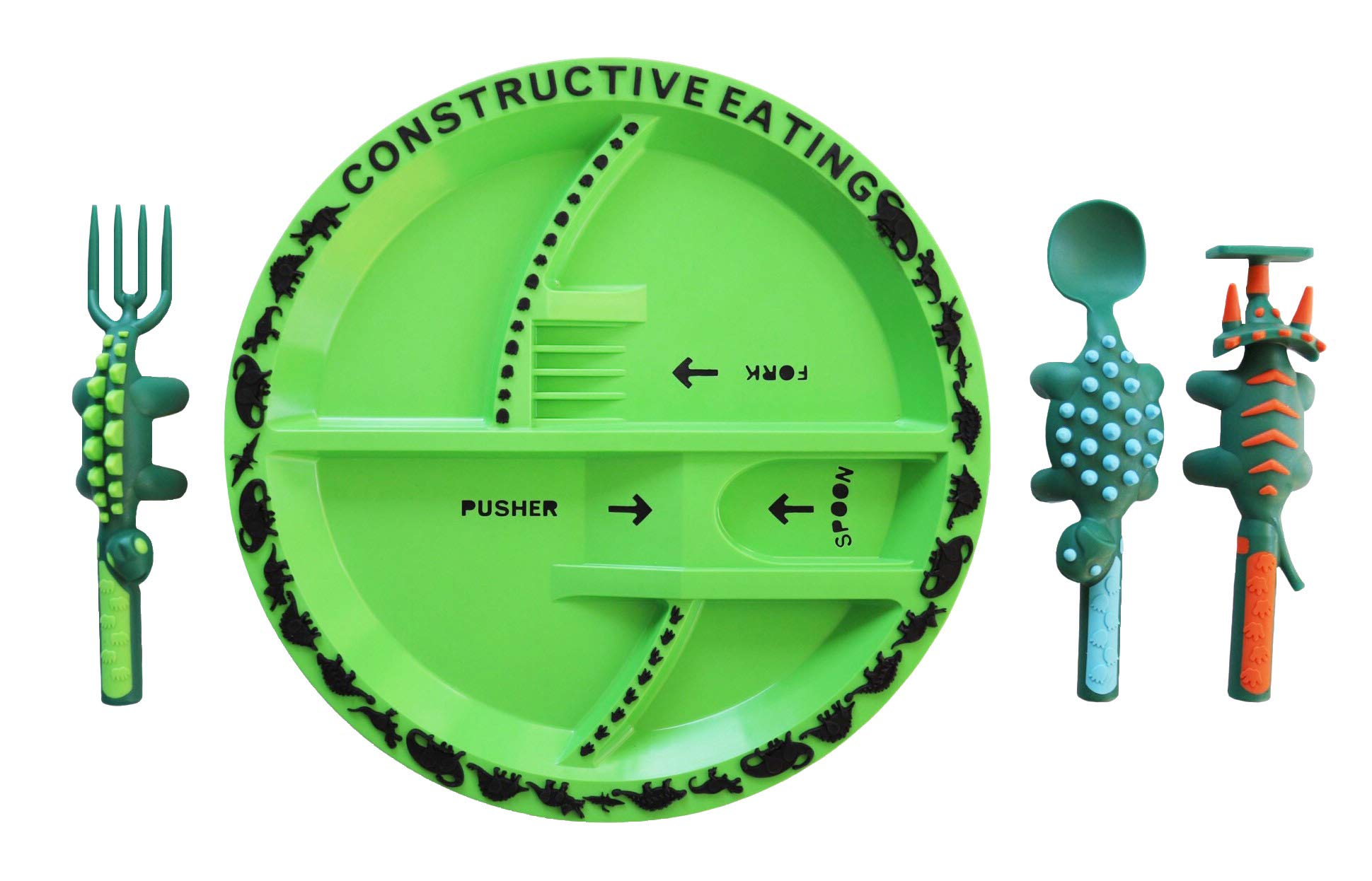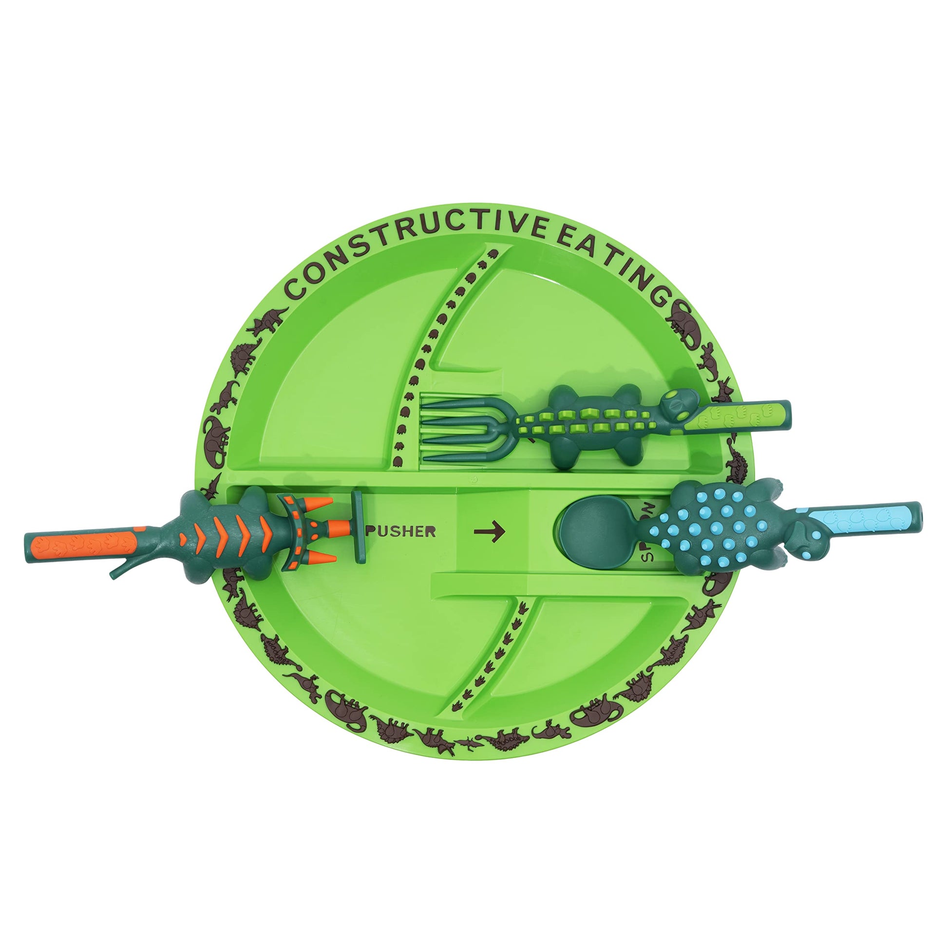 - Q: How does this set encourage independent eating? A: The Dino Pusher and other utensils are designed to help children develop fine motor skills and independence while making mealtime fun.