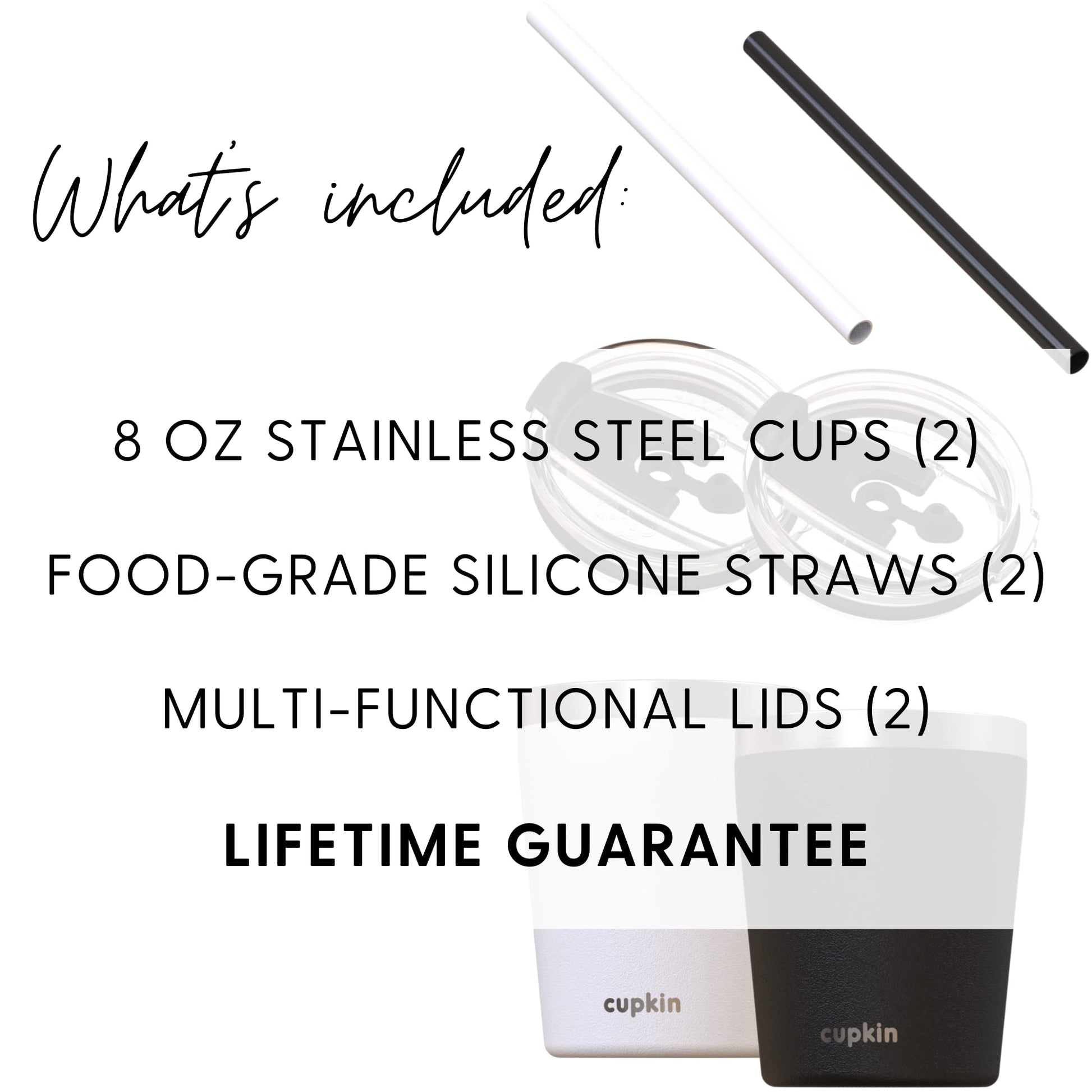 - Q: How many cups are included in a set? A: Each set includes two stainless steel cups, two lids, and two reusable silicone straws.