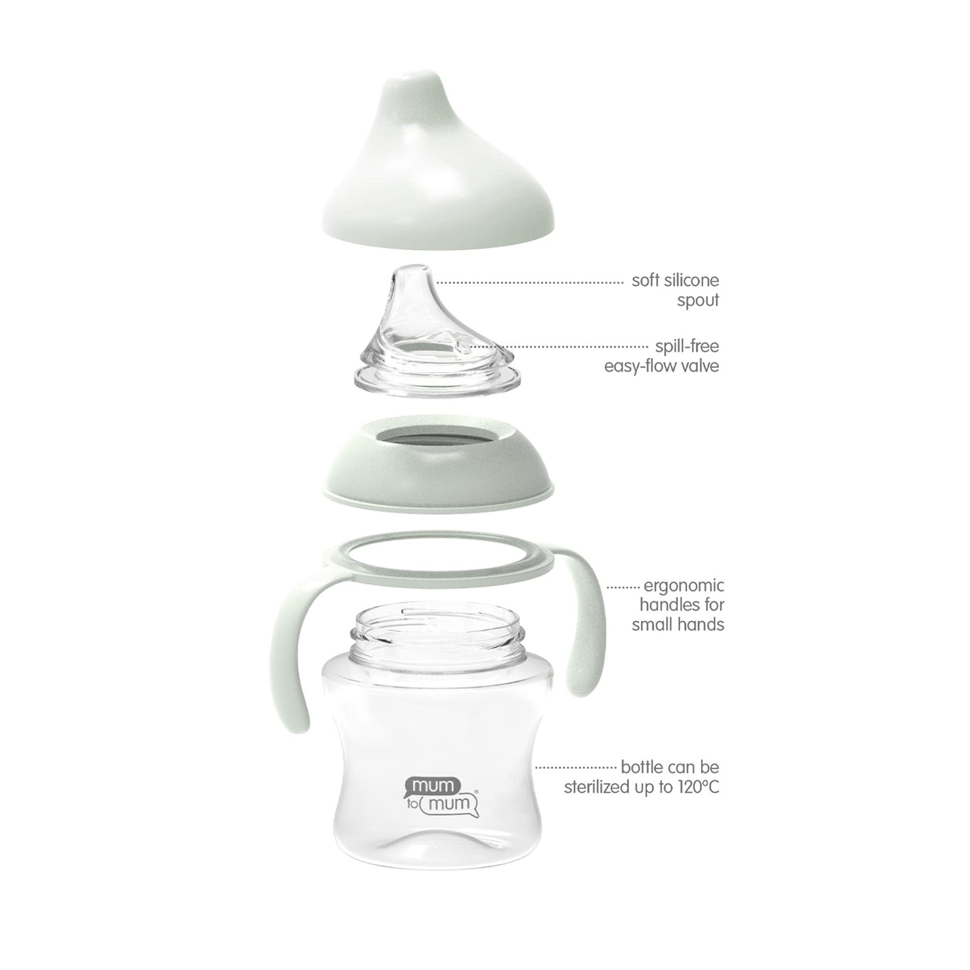 - Q: What features does the mum to mum spout cup have? A: The spout cup features a soft silicone spout, ergonomic handles for small hands, and can be sterilized up to 120 degrees Celsius.