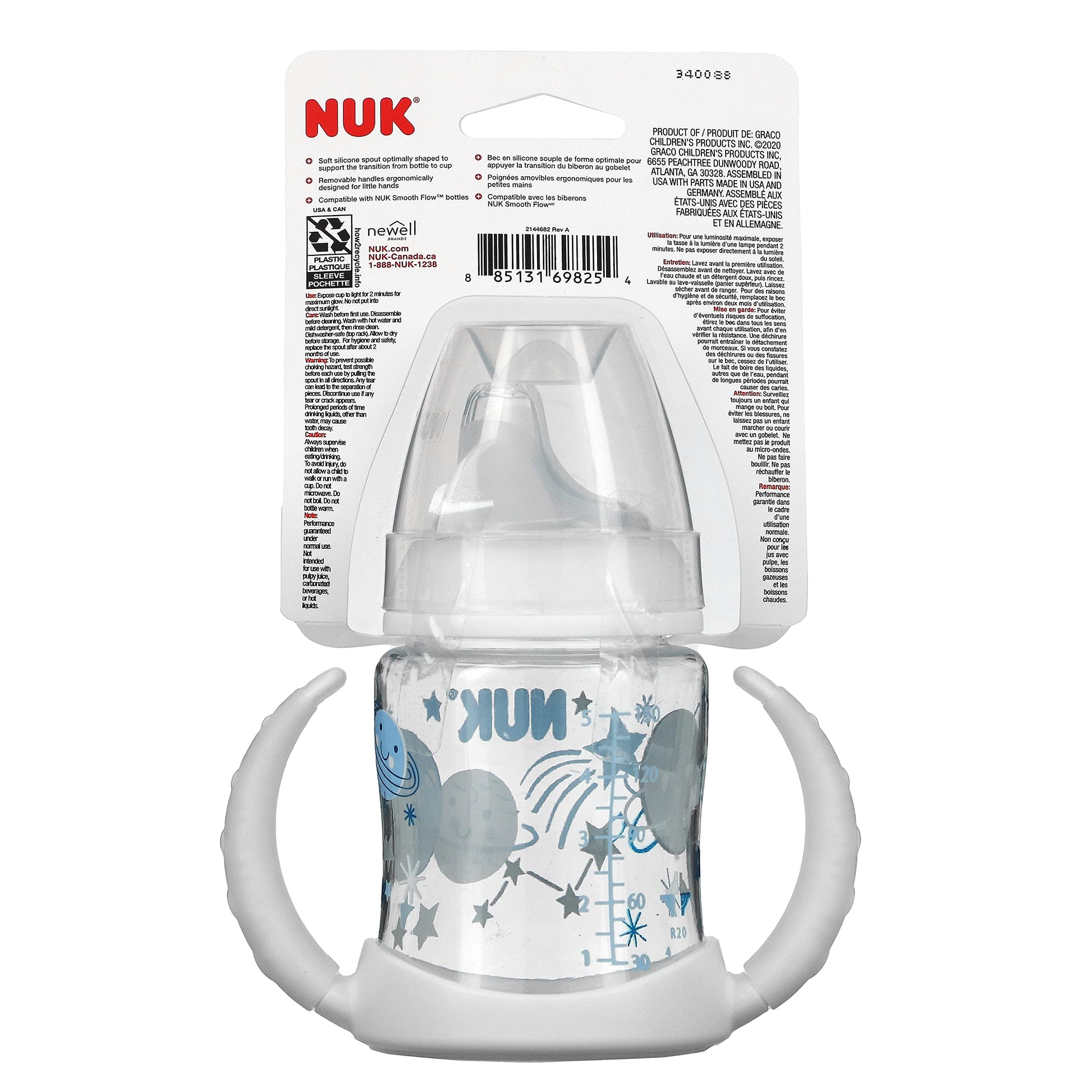 - Q: How does the NUK Learner Cup support the transition from bottle to cup? A: The NUK Learner Cup is designed to promote the transition from breast or bottle to sippy cup with its spill-proof spout and easy-grip handles.