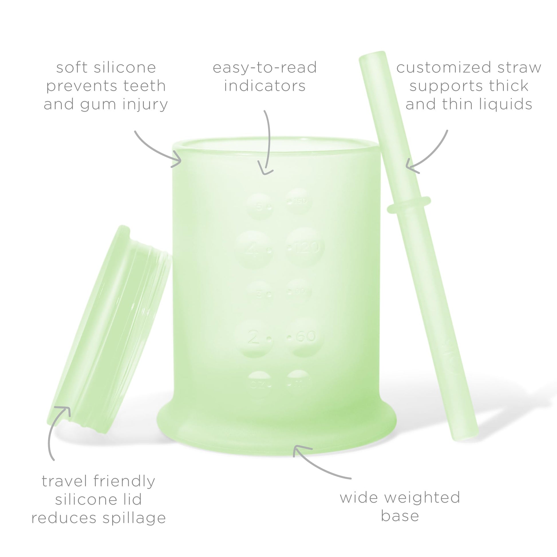 The ability to drink independently from a sippy or from an open cup are important feeding and developmental achievements for a toddler The Olababy 100% Silicone Training cup with Silicone Lid and Straw is safe and easy to use Our system is designed to encourage a smooth transition to independent drinking, from sippy to an open cup They are made of 100% toxin free silicone They are gentle and flexible, protects our babiesA soft gum and erupting teeth The weighted base is specifically designed for little hands and does not tip over easily, providing stability for toddlers trying to master fine motor skills Our cup is translucent for toddlers to see how much liquid is inside The transparency provides visibility and eliminates anxiety associated with drinking out of the unknown The see-through measuring dots allow parents to monitor liquid consumption while doubling as a measuring cup Our silicone lid prevents spillage while the straw is customized to support thick and thin liquids