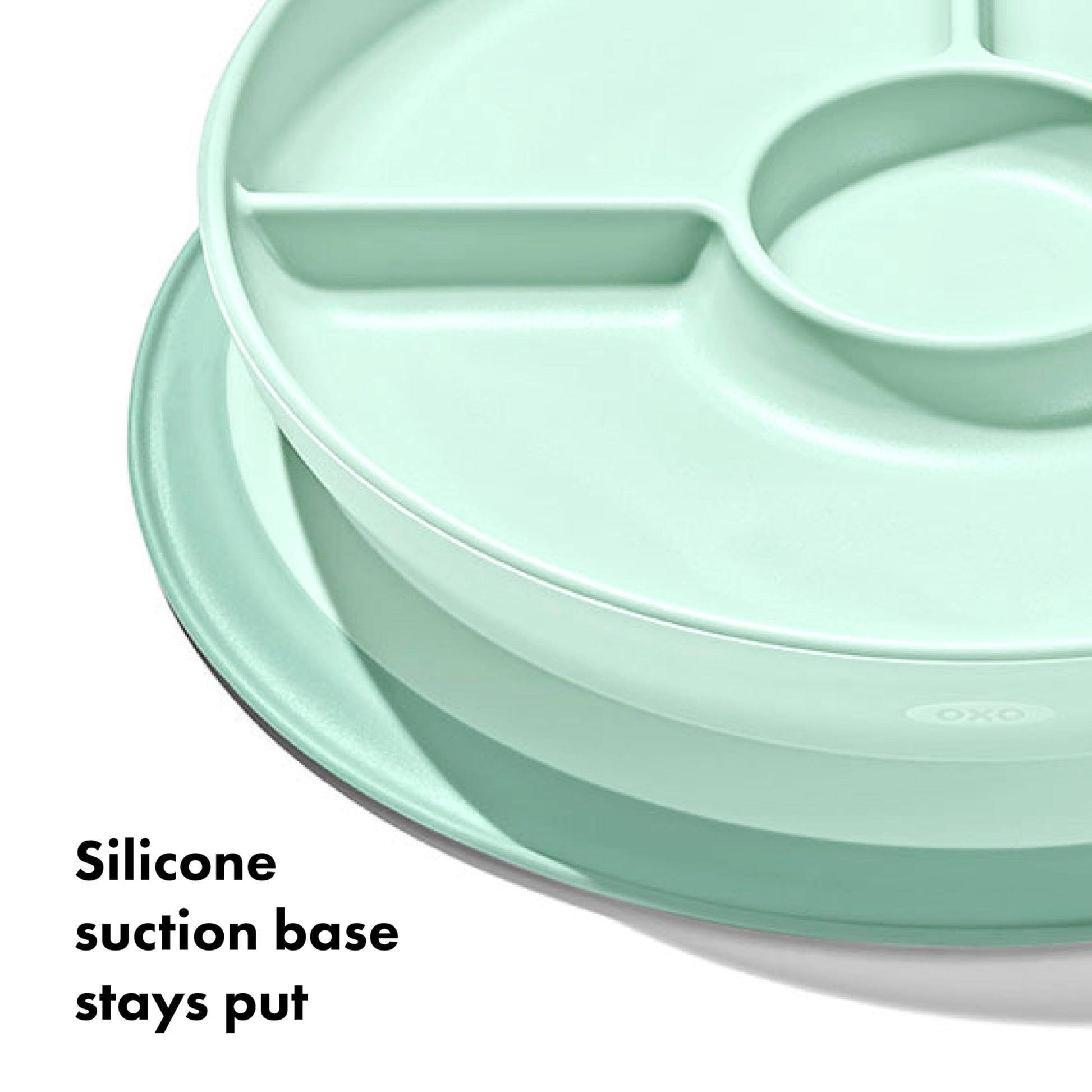 - Q: What material is the OXO Tot Stick and Stay Suction Divided Plate made of? A: The OXO Tot Stick and Stay Suction Divided Plate is made from silicone, which provides a non-slip and safe surface for mealtime.