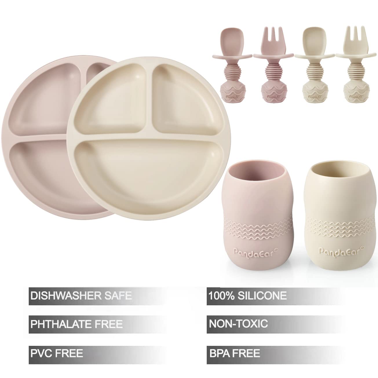 - Q: How many pieces are included in the feeding set? A: The set includes two silicone divided suction plates, two toddler cups, two baby forks, and two baby spoons.