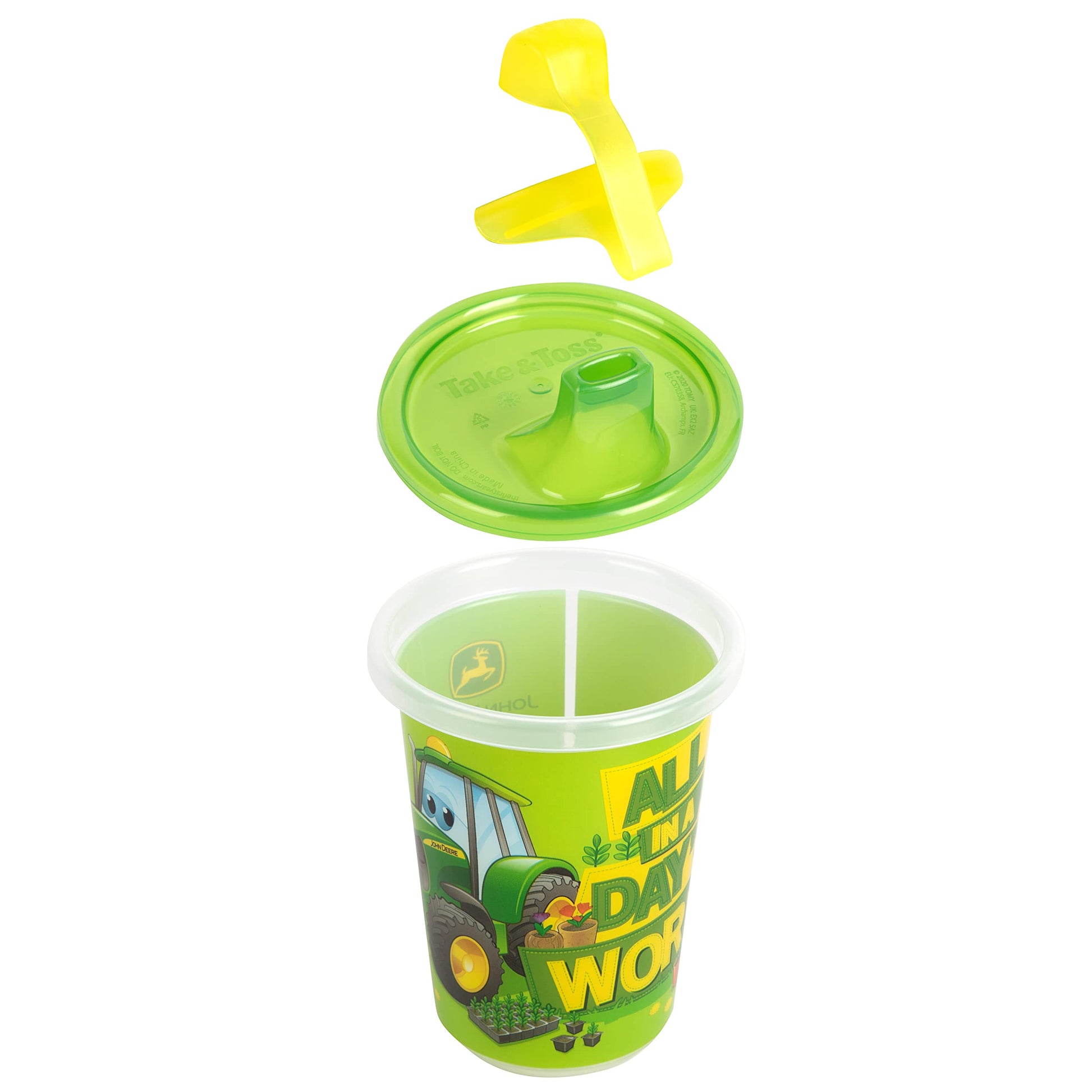 - Q: What is included in the Take & Toss John Deere Sippy Cups Party Pack? A: The Take & Toss John Deere Sippy Cups Party Pack includes ten 10-ounce sippy cups and two travel caps.