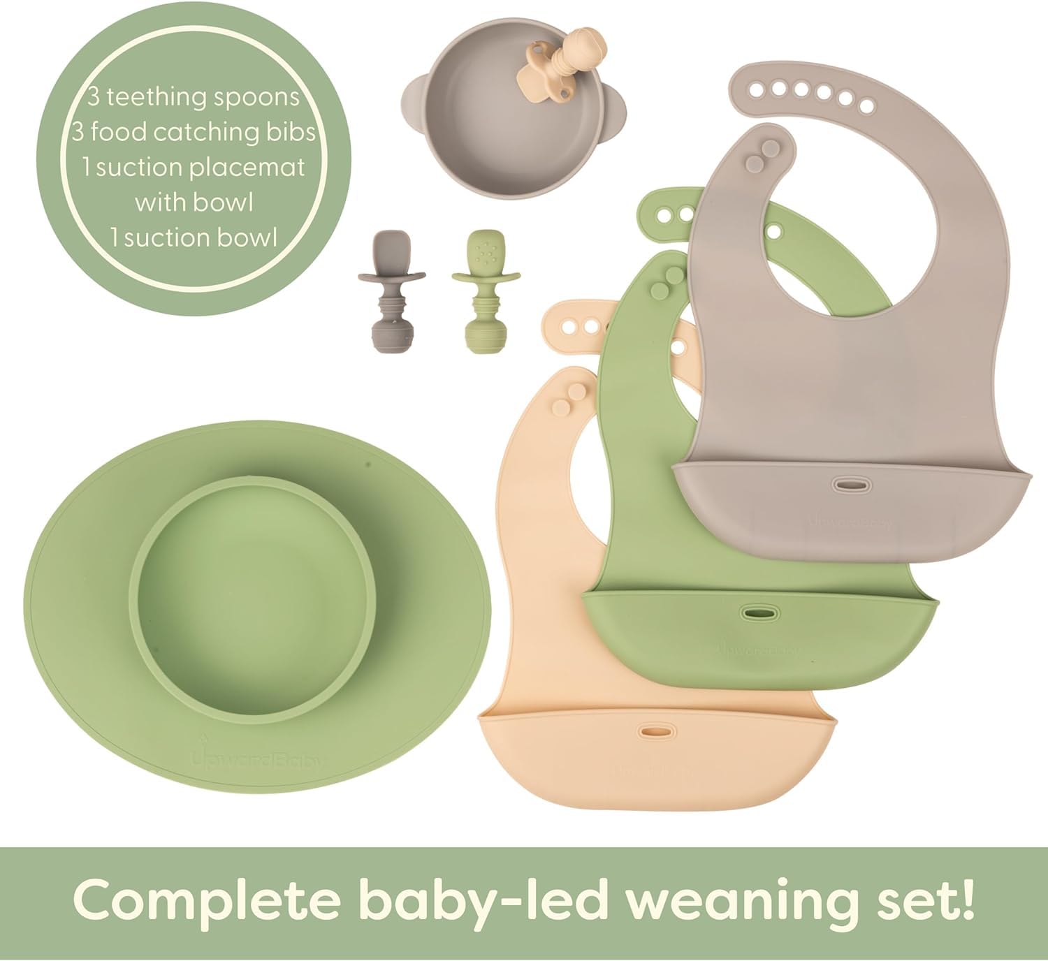 Do Not Buy A Baby Led Feeding Set Before You Read This!Looking for a safe silicone suction bowl set to introduce new foods to your toddlers meals? Presenting The Ultimate Baby Tool Set By UpwardBaby!Now you dont have to settle for baby dishes with poor suction, baby bibs with toxic smells, or baby feeding spoon sets delivered with missing items. The UpwardBaby baby led weaning set is finally here to make your kids experience of trying new foods cleaner, easier and more fun.Why Choose Our Baby Led Weaning Spoons Set? Here Are The Top 3 Reasons!? KEEP FOOD FROM GETTING ALL OVER THE FLOOR: Unlike many infant dishes, our baby bowl with the strong suction base will stay put no matter how determined your little one is to throw it from his high chair. The food catching bib will prevent your messy eater from causing chaos in the kitchen. ? INTRODUCE SOLID FOODS EASIER: Our chewable spoon set helps parents do more than just feed their little ones - they also make experimenting with new foods more enjoyable, and encourage your child to become an independent eater.? SAVE PRECIOUS TIME ON CLEANING: Wipe clean your toddler training spoon, baby silicone bibs, suction placemat, and baby bowl or place the toddler items in the dishwasher. Need More Reasons? ? Non-Toxic Baby Kitchen Set - 100% Soft, Food-Grade Silicone ? Reusable, Eco-Friendly Baby Utensils - Microwave-Safe? Must Have Baby Items For Boys, Girls - Awesome Baby Registry, Birthday GiftWhat You Get: 1 * Silicone Suction Cup Bowl 4.5 Diameter x 2 Tall3 * Silicone Bibs With Food Catcher 11.5 x9 3 * Silicone Baby Spoons 3 x1.7 5x1 1 * Suction Placemat 12 x 9.5 x 1.5 Why Wait?Click Add To Cart NOW To Get Your Set!