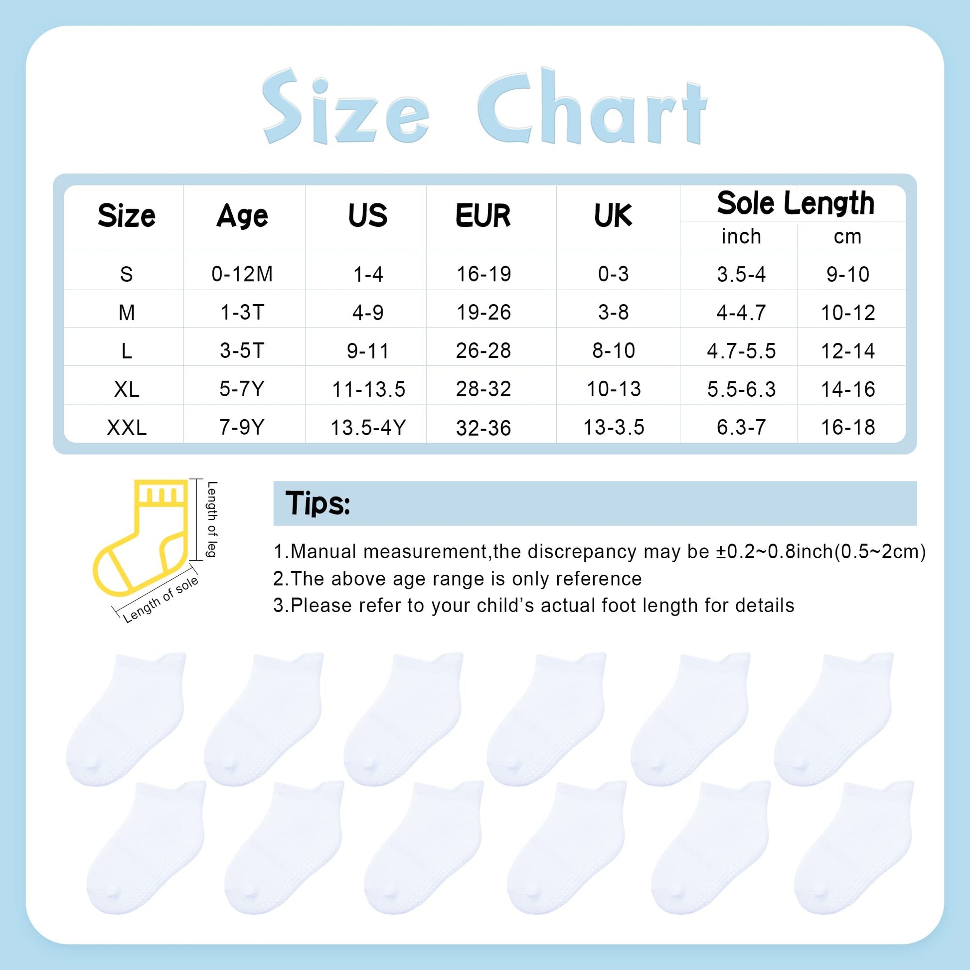 - Q: What age range do the socks fit? A: The socks are suitable for children aged 1 to 5 years, with specific size recommendations for each age group.