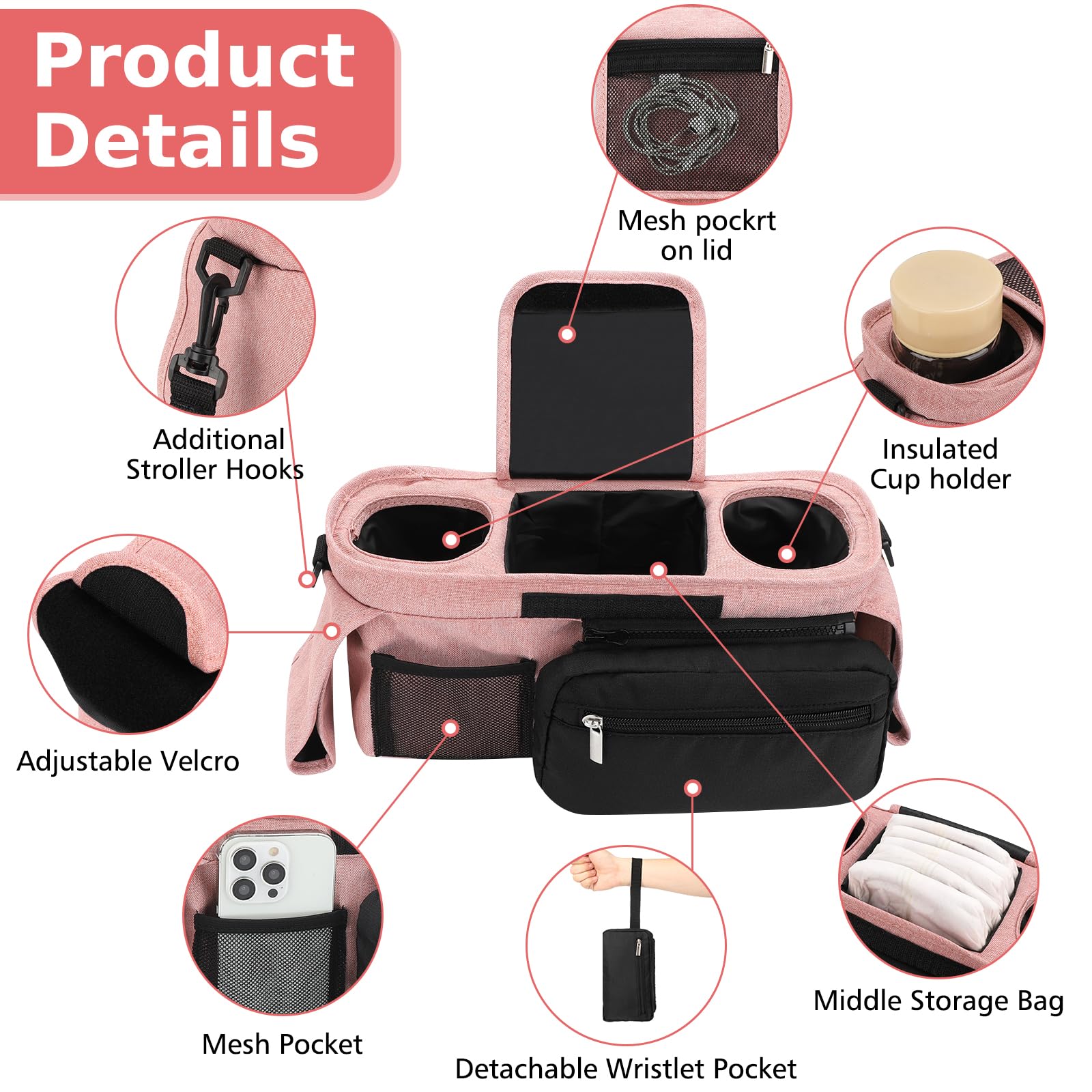 - Q: Can I use the stroller organizer when I'm not using a stroller? A: Yes, the organizer includes a shoulder strap, allowing it to be used as a standalone bag for outings when not attached to a stroller.