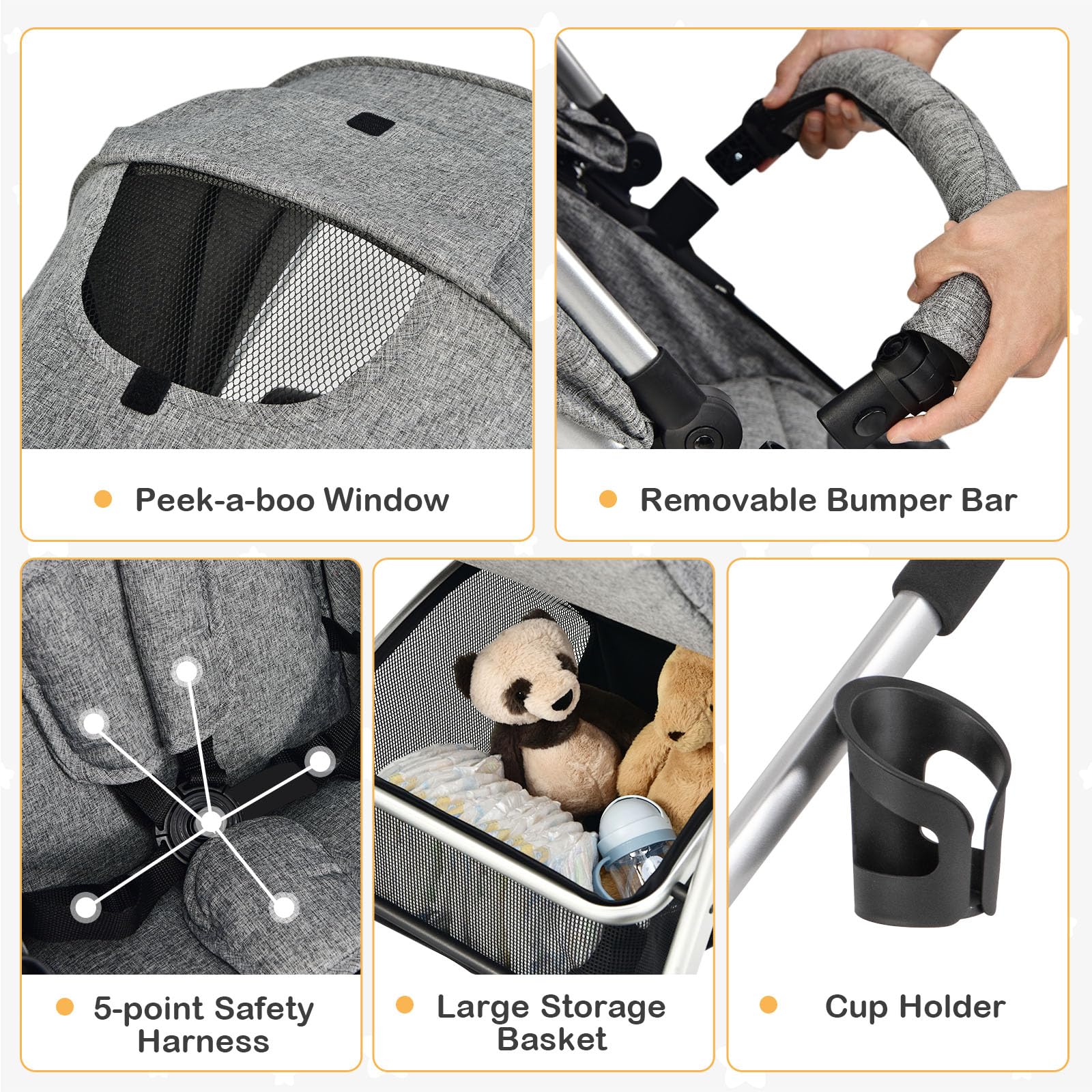 - Q: How does the stroller ensure my baby's safety? A: The stroller features a 5-point safety harness and a one-step brake on the rear wheels to secure your baby while stationary.