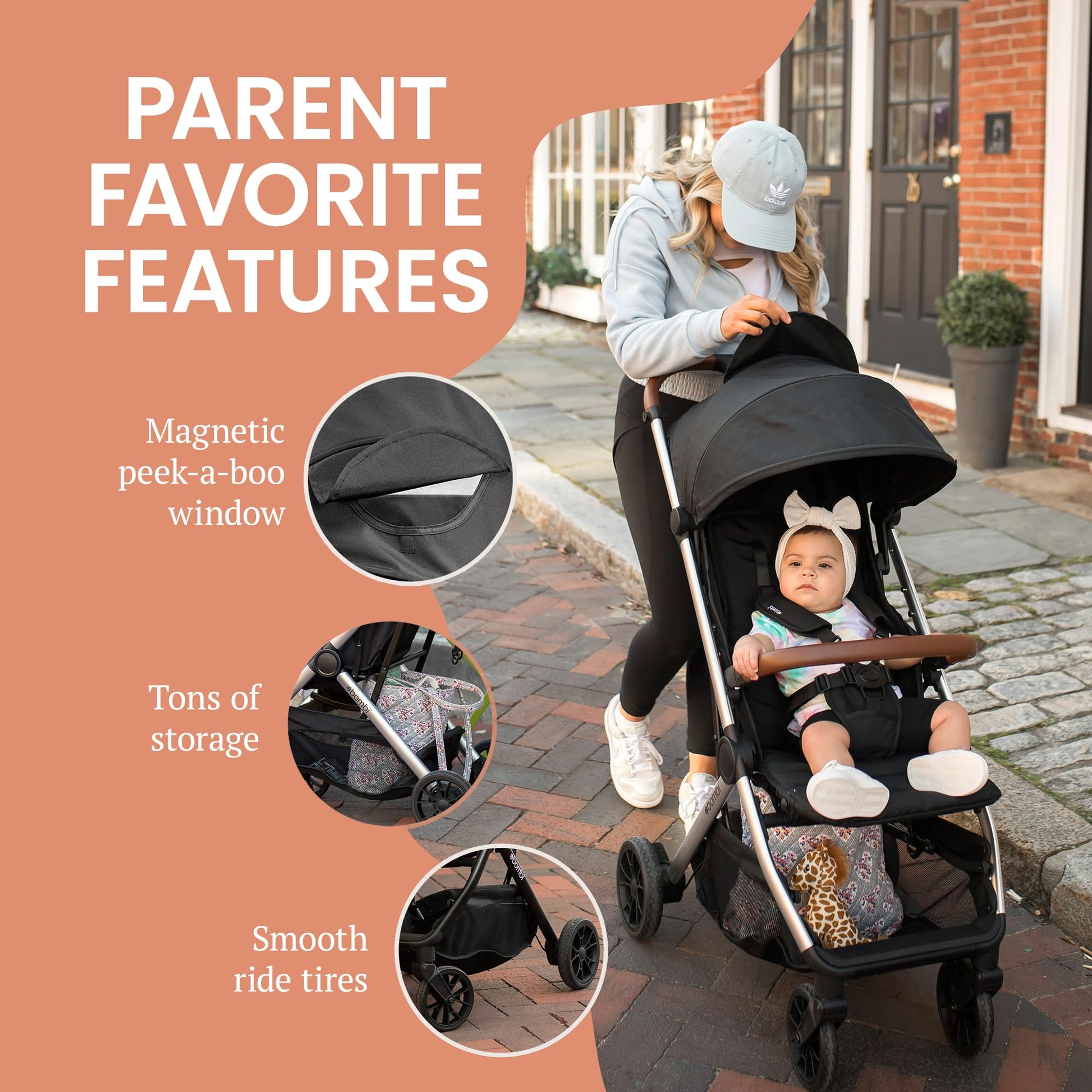 - Q: What kind of storage options does the stroller have? A: The stroller features an XL easy-access storage basket, a rear parent zip pocket, an in-seat child pocket for drinks, and small side pockets for AirTags.