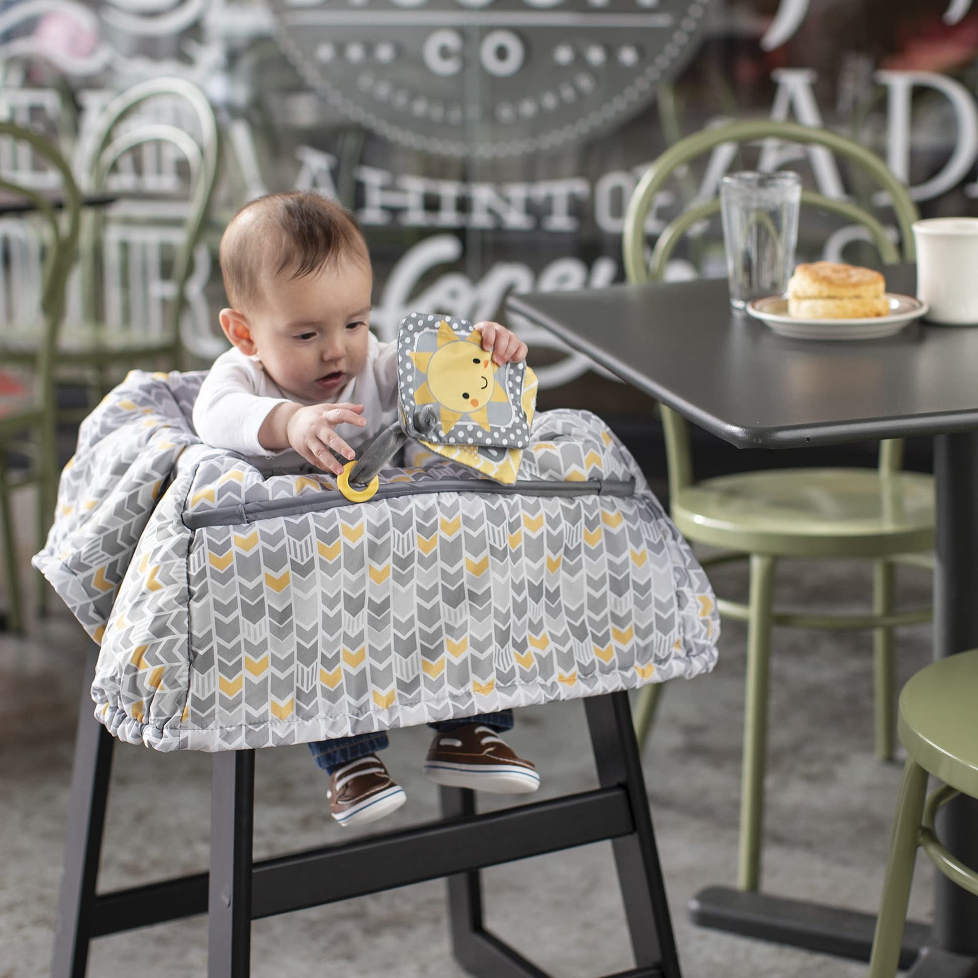 - Q: Does the Boppy Shopping Cart Cover come with a toy tether? A: Yes, it includes a built-in SlideLine toy tether that keeps toys attached and off the floor, providing entertainment for your baby while shopping.