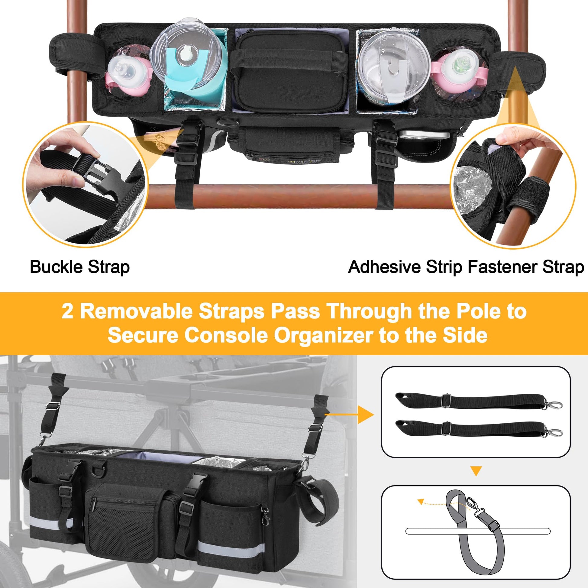 - Q: Can the cooler bag be used separately? A: Yes, the removable cooler bag can be taken out of the stroller organizer and used separately to keep your beverages or food cold.