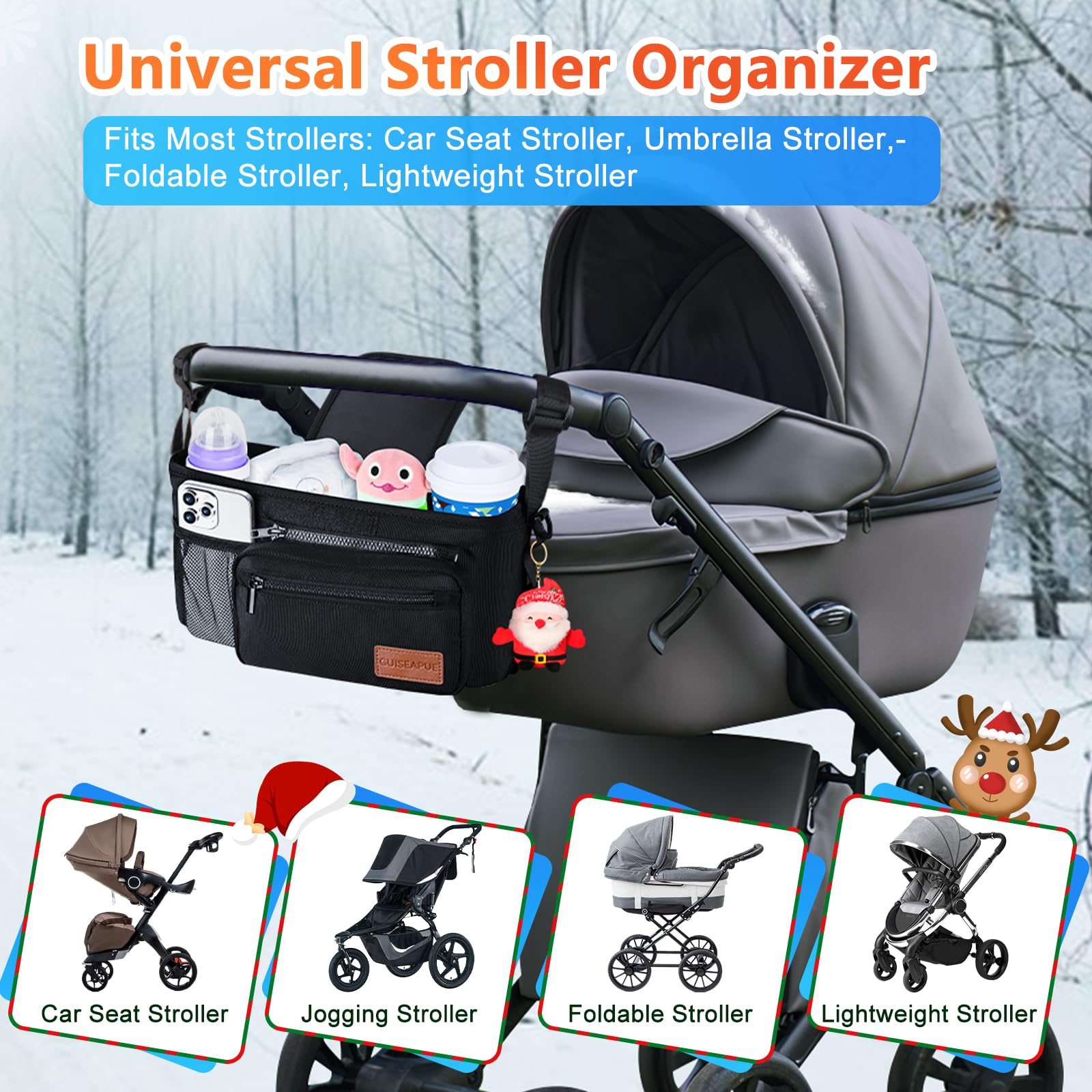 - Q: What kind of items can I store in the stroller organizer? A: You can store various items, including milk bottles, coffee cups, diapers, baby toys, snacks, and more, keeping everything organized and within reach.