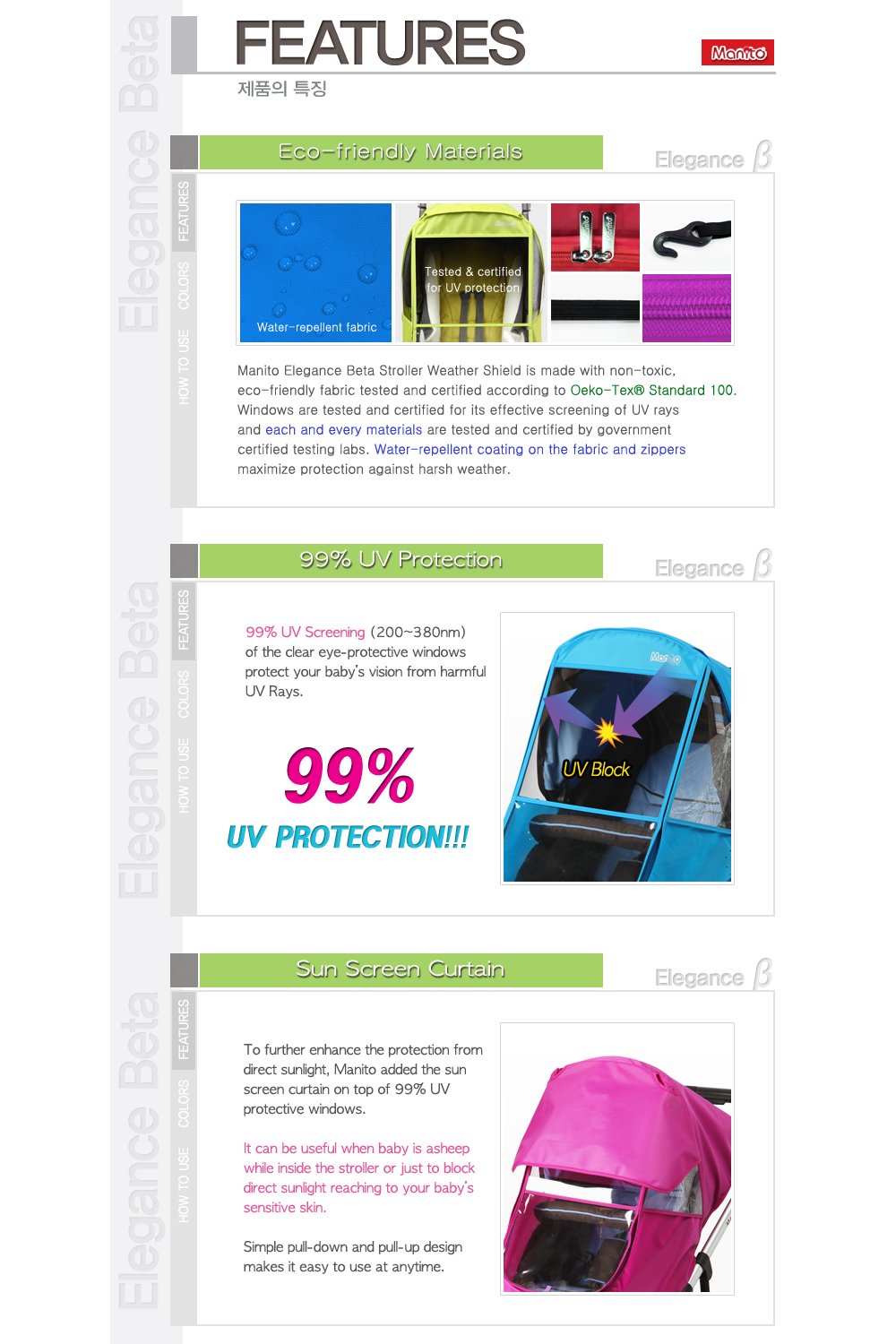 - Q: What is the Manito Elegance Beta Stroller Weather Shield designed for? A: The Manito Elegance Beta Stroller Weather Shield is specifically designed to fit most detachable reclining seat strollers with reversible seating positions, offering protection from various weather conditions.