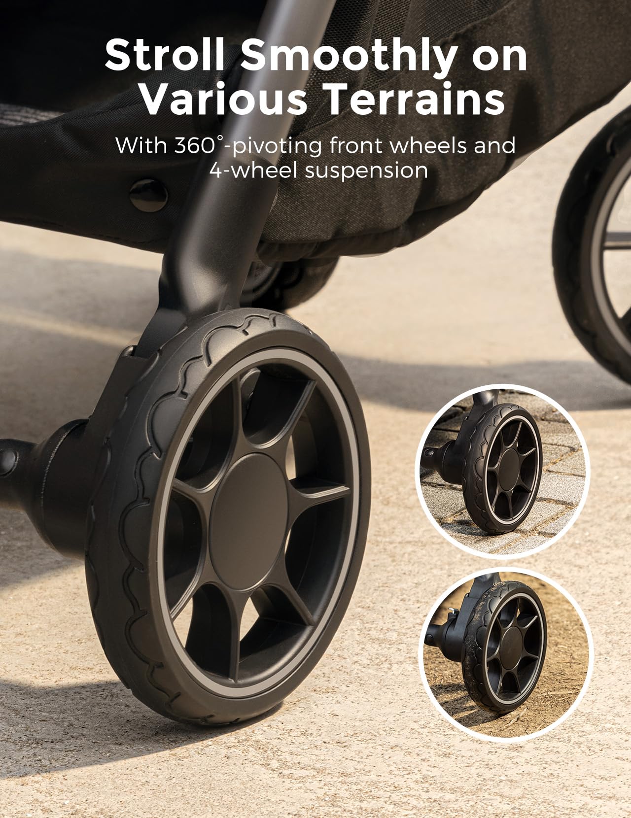 - Q: Is the stroller easy to steer on different terrains? A: Yes, the stroller is equipped with 360-degree swiveling front wheels and all-wheel suspension for smooth navigation on various terrains.