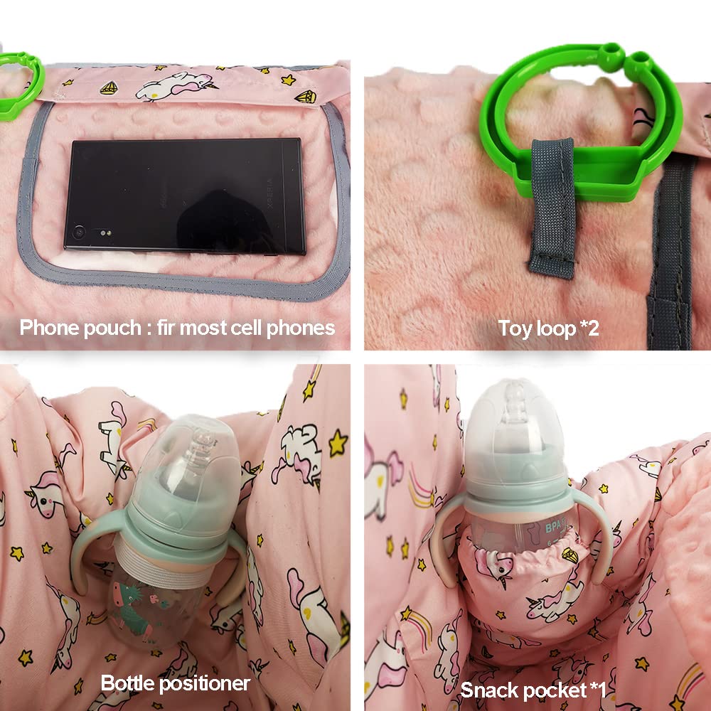- Q: What features are included for baby entertainment? A: The cover includes a built-in phone pocket to entertain babies, along with two toy loops where you can attach favorite toys.