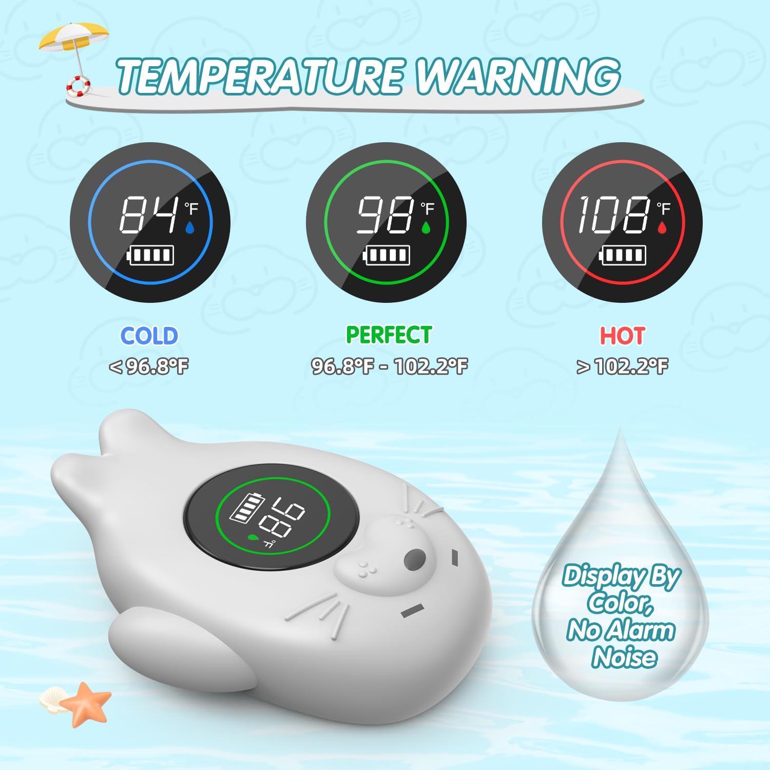 - Q: How does the temperature alarm feature work? A: The thermometer features a color-changing display ring that indicates water temperature: red for too hot, blue for too cold, and green when the temperature is just right.