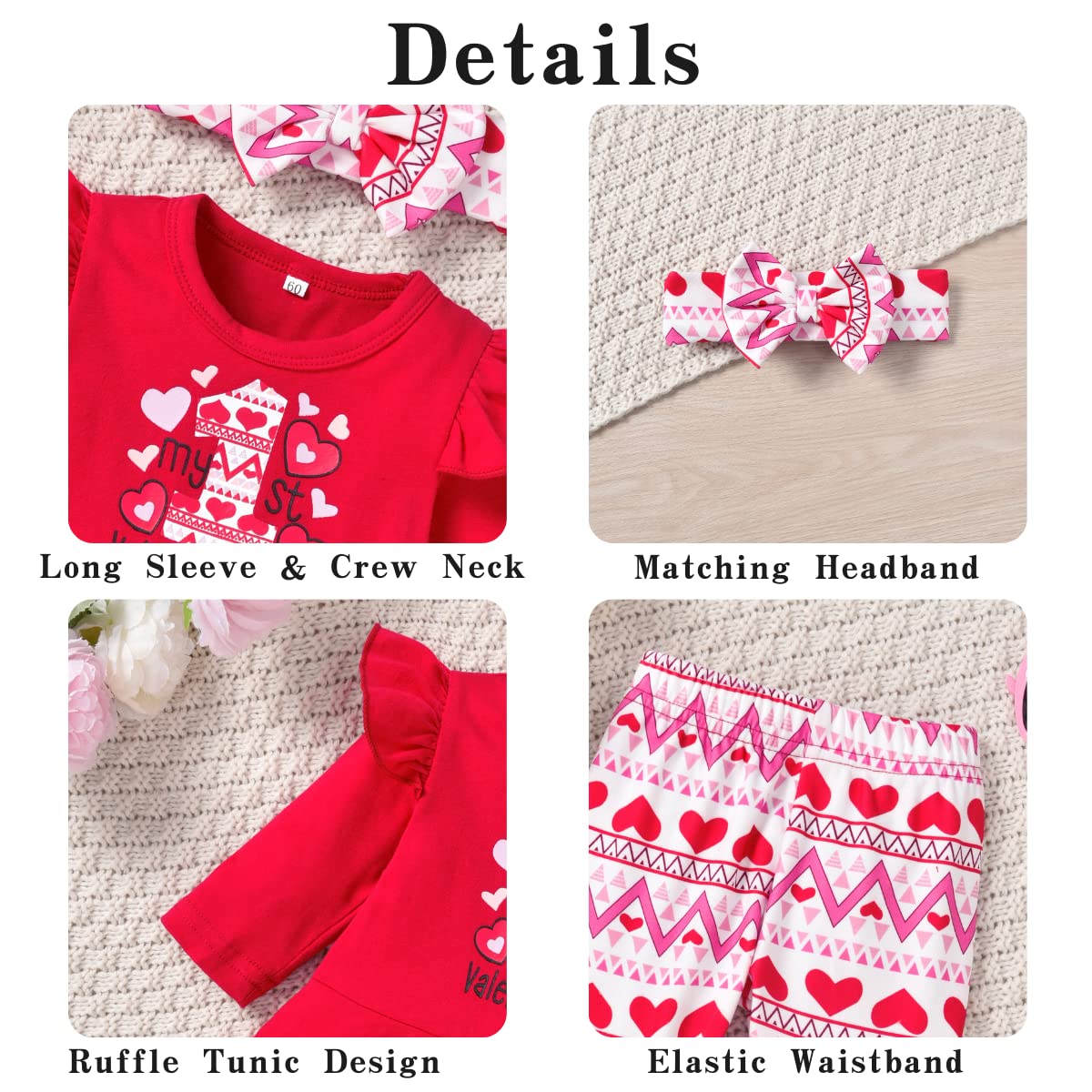 - Q: What is included in the Aalizzwell Baby Girl Valentines Day Outfit? A: The outfit includes a classic crew neck tunic top, pants, and a matching headband, all featuring a special Valentines Day theme print.