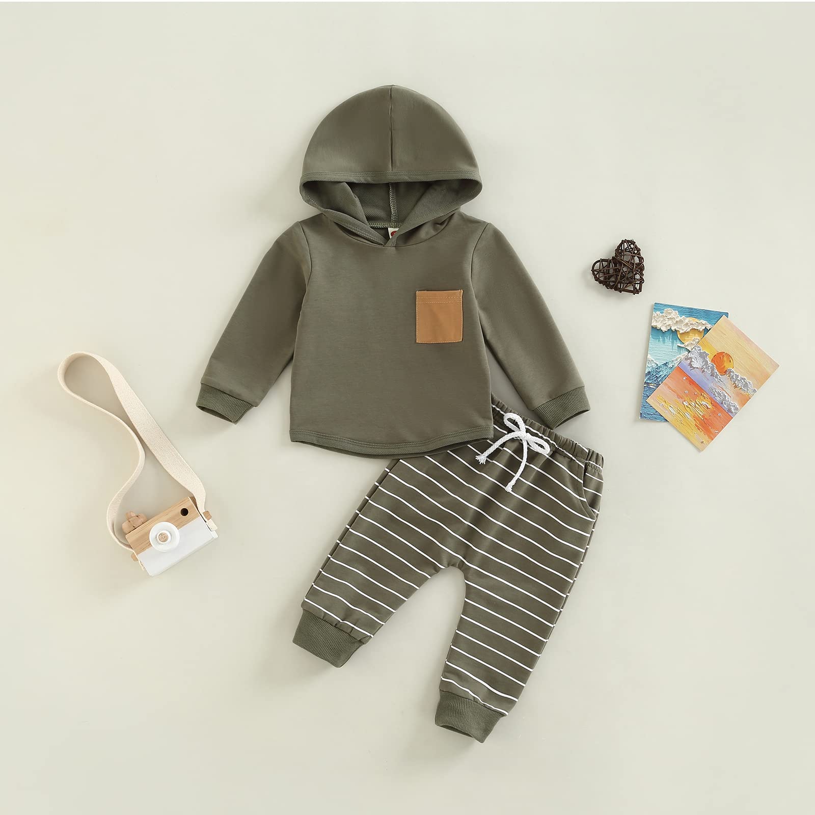 Baby Boy Clothes 3 6 9 12 18 24M 3T Pants Set Hooded Patchwork Hoodie Striped Sweatpants Fall Winter Outfit (C-Army Green, 0-6 M