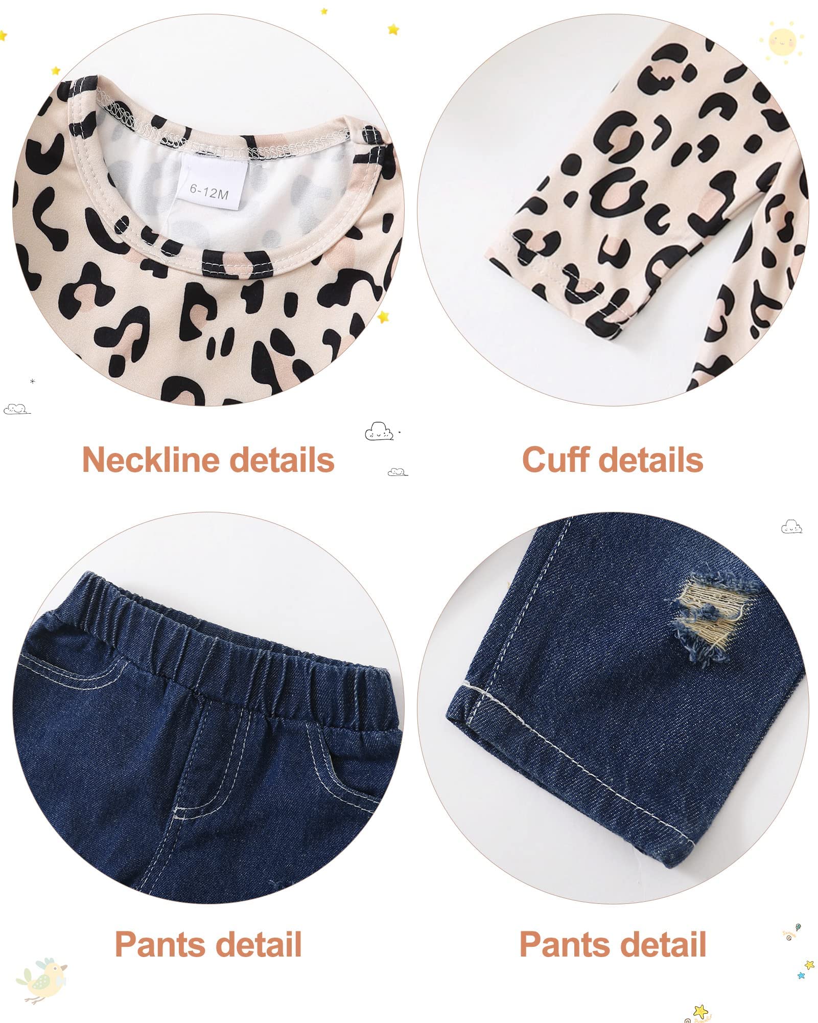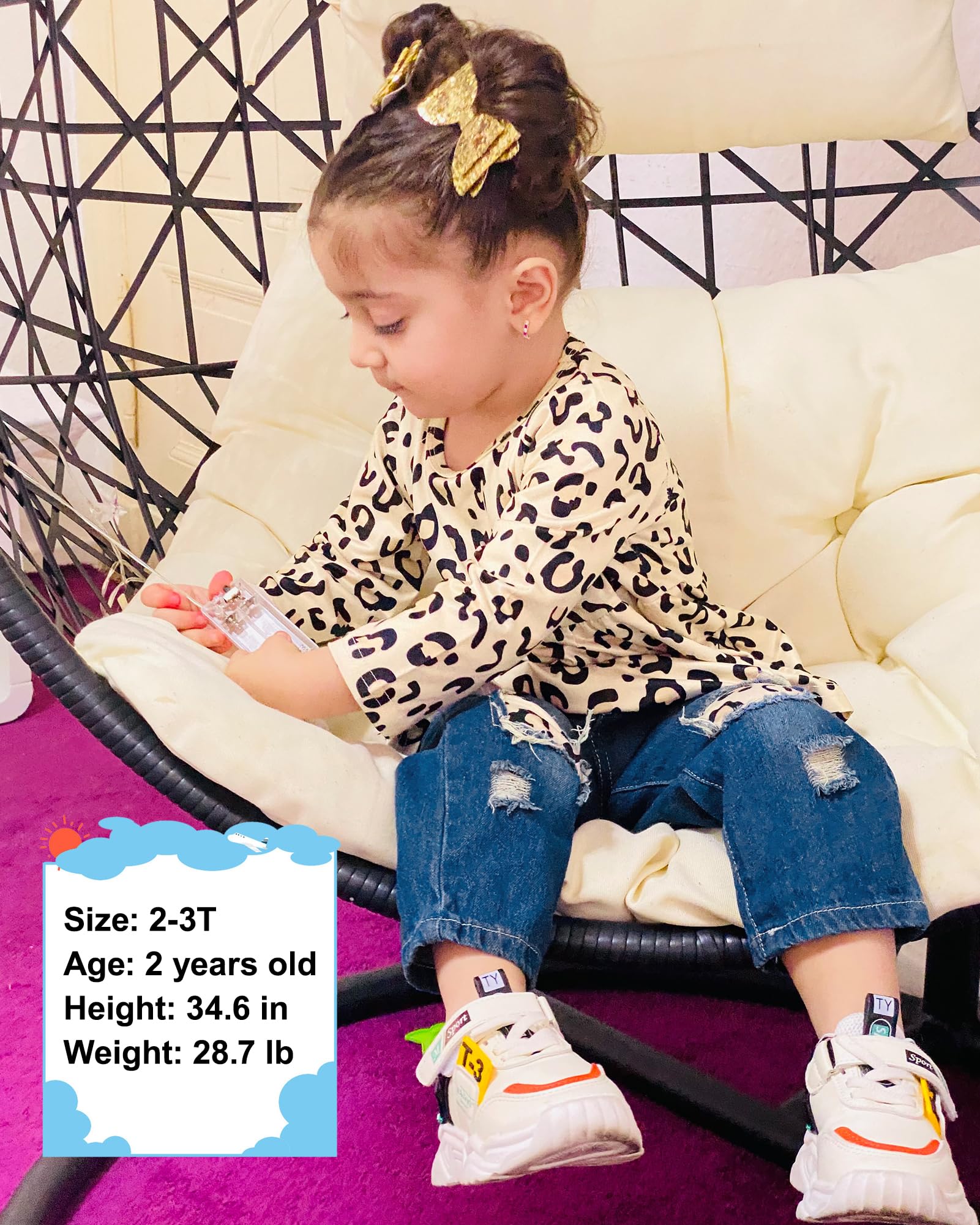 - Q: What is the design style of this pant set? A: The pant set features a cute floral print top with ruffles paired with ripped jeans, creating a fashionable and adorable look for your little girl.
