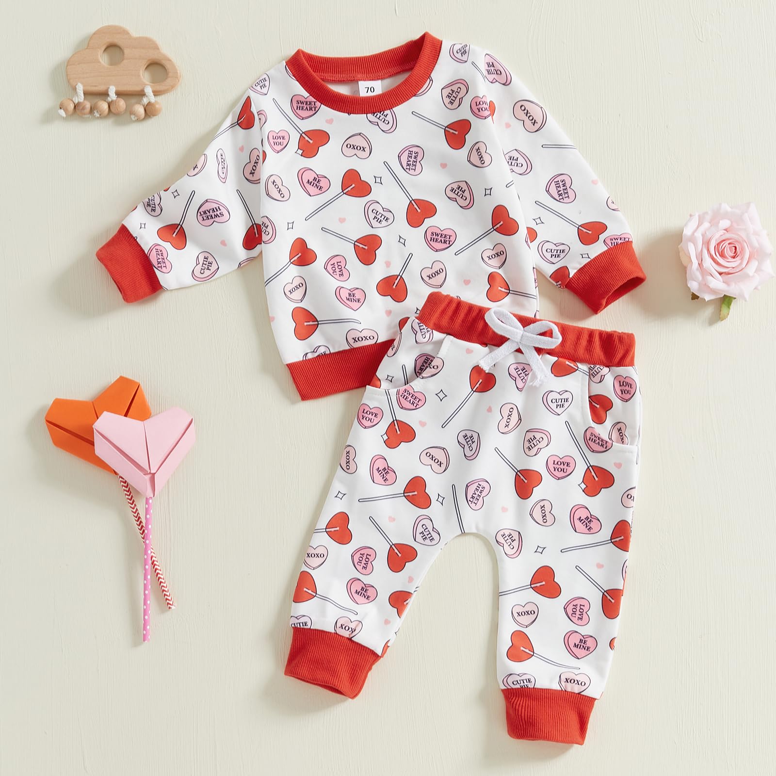 - Q: Does this outfit come in different colors or patterns? A: The COORALLY outfit features a printed design with hearts and letters, specifically in a white color scheme perfect for Valentine's Day.