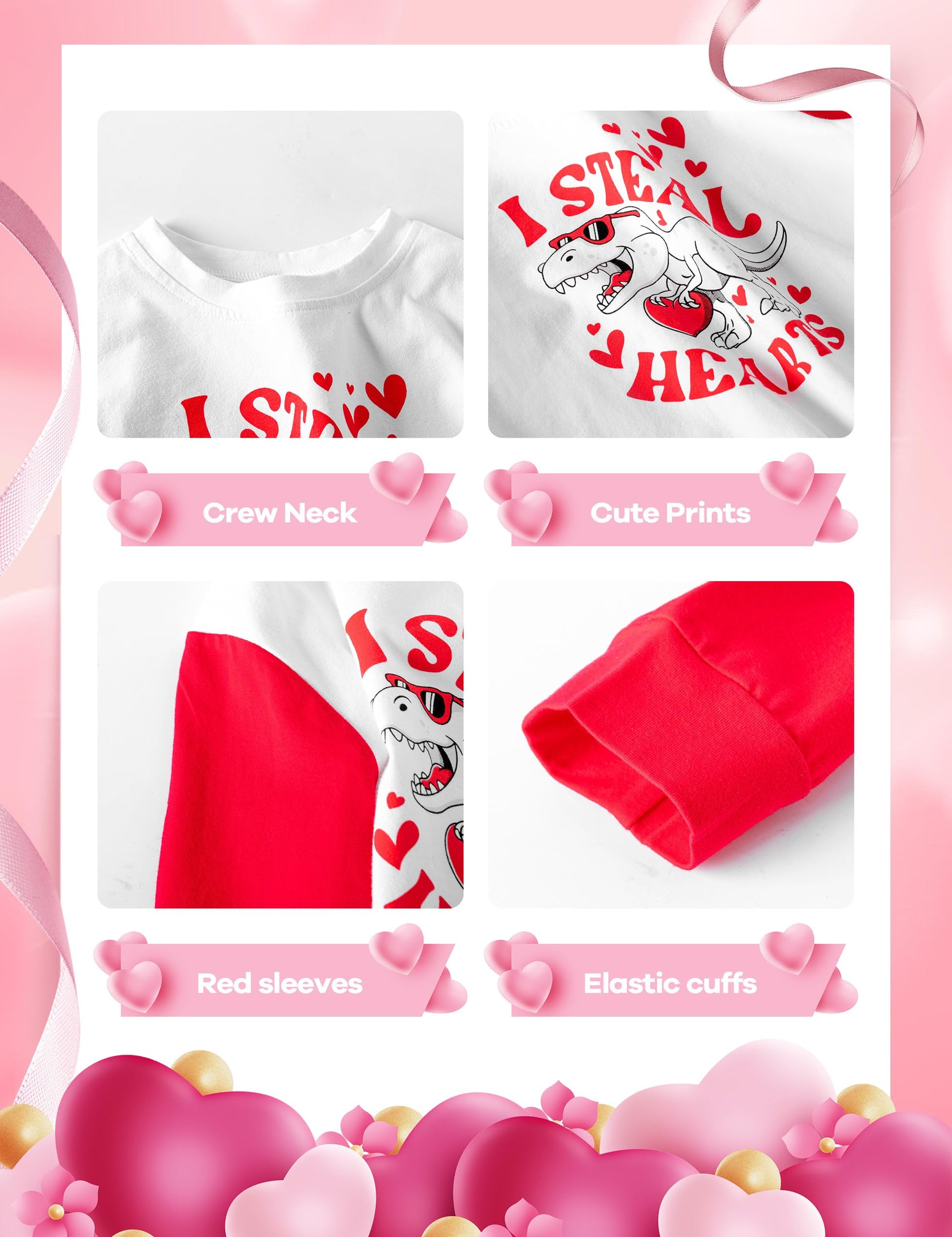 - Q: What is included in the two-piece set of this outfit? A: The outfit includes a white top with red sleeves and a matching pair of casual pants. The top features a charming dinosaur pattern and the phrase 'I steal hearts,' while the pants have a heart pattern.