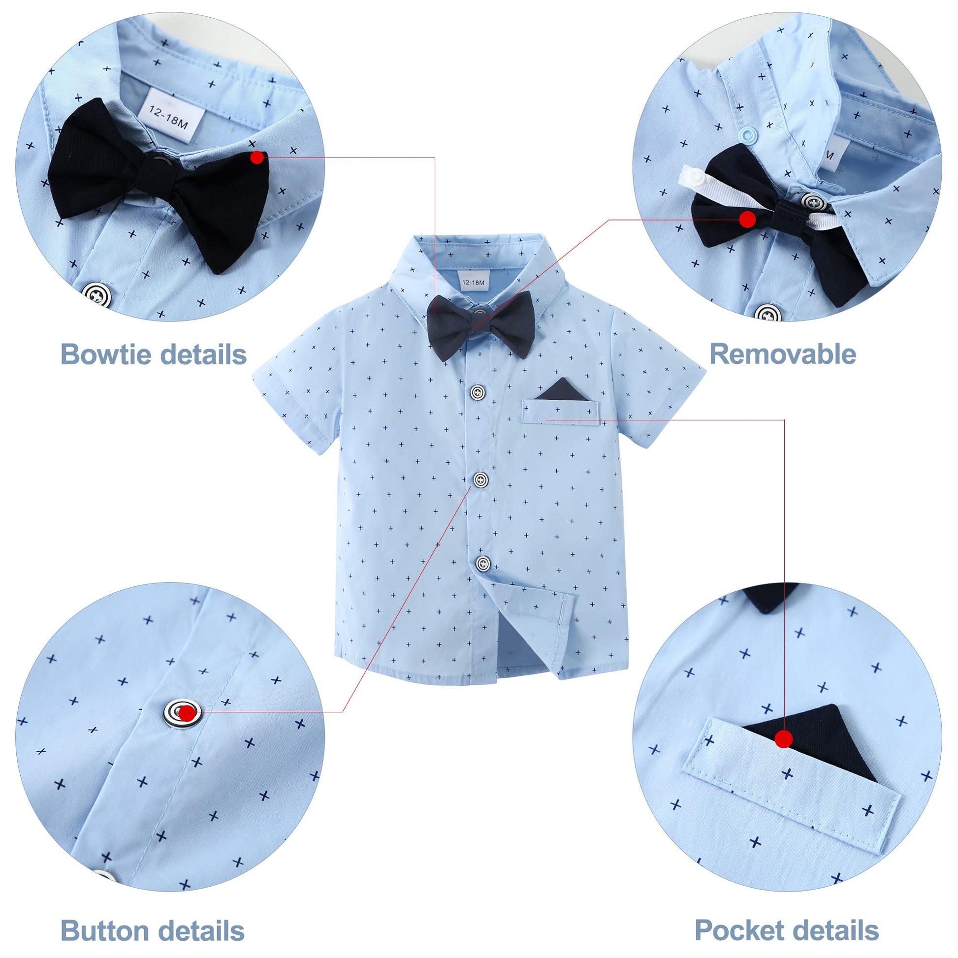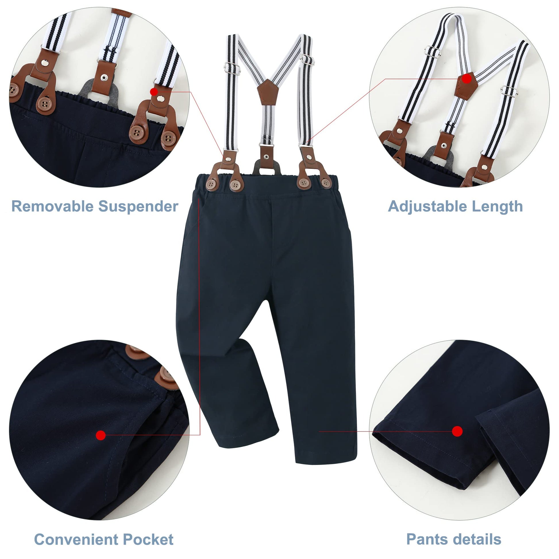 - Q: Does the outfit come with accessories? A: Yes, the outfit includes a dress shirt, suspenders pants, and a removable bow tie, providing a complete gentleman's look.