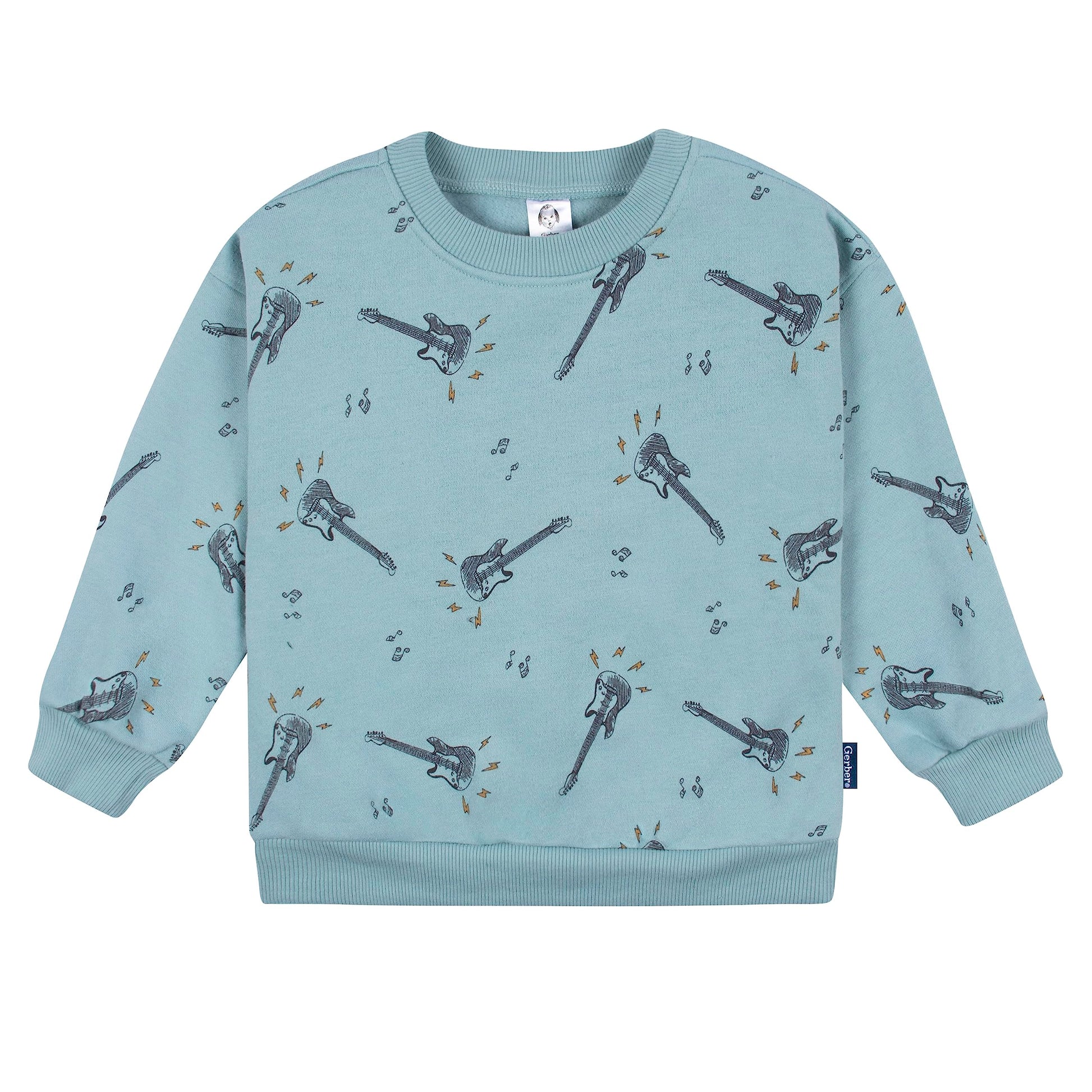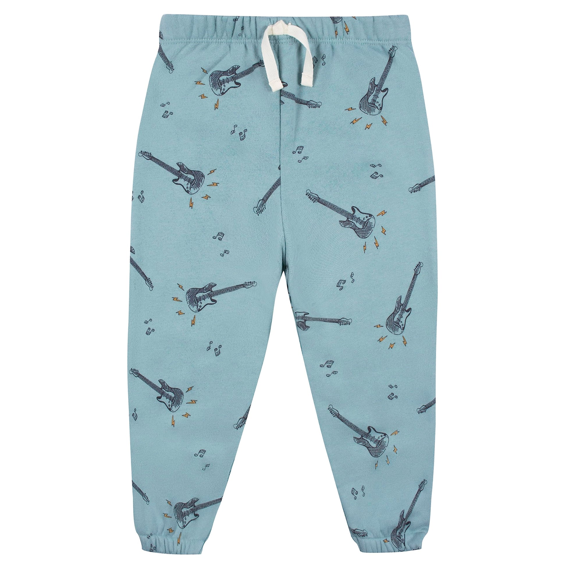 - Q: What is the design of the fleece sweatshirt and jogger set? A: The set features a teal color with a fun guitar pattern, making it stylish and appealing for young children.