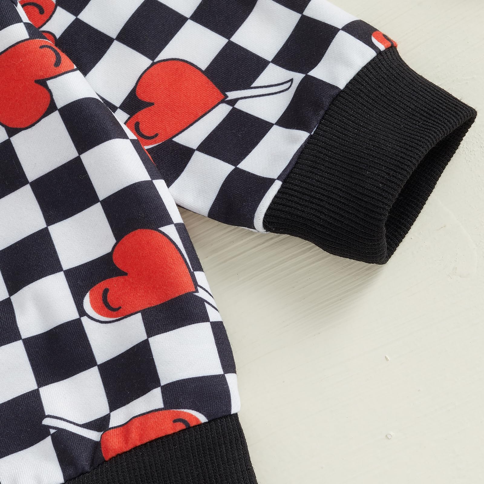 - Q: Does the outfit feature any special designs? A: Yes, the outfit features a crew neck long sleeve sweatshirt top with a cute love heart print, paired with pocketed trousers.