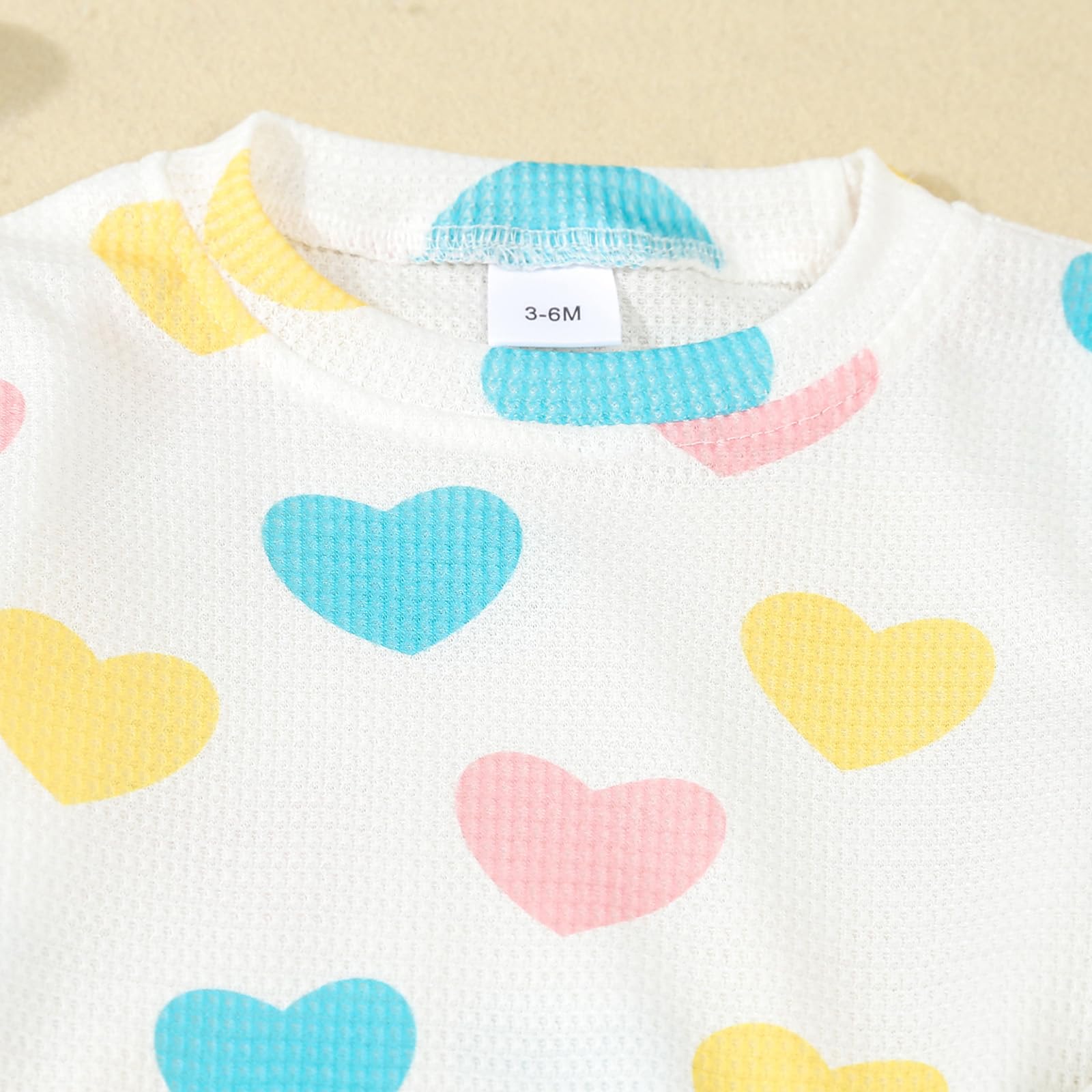 - Q: What design features does the outfit have? A: The outfit features cute bowknot and heart prints, long sleeves, a crew neck, and matching elastic waist long joggers.