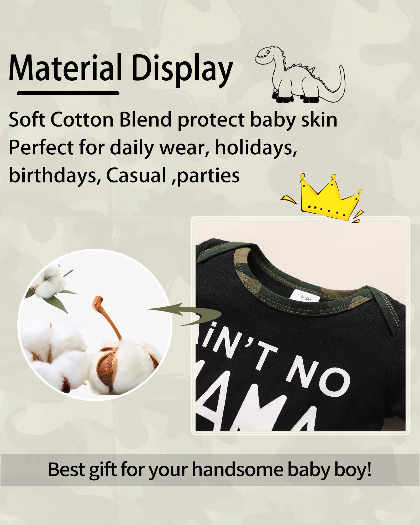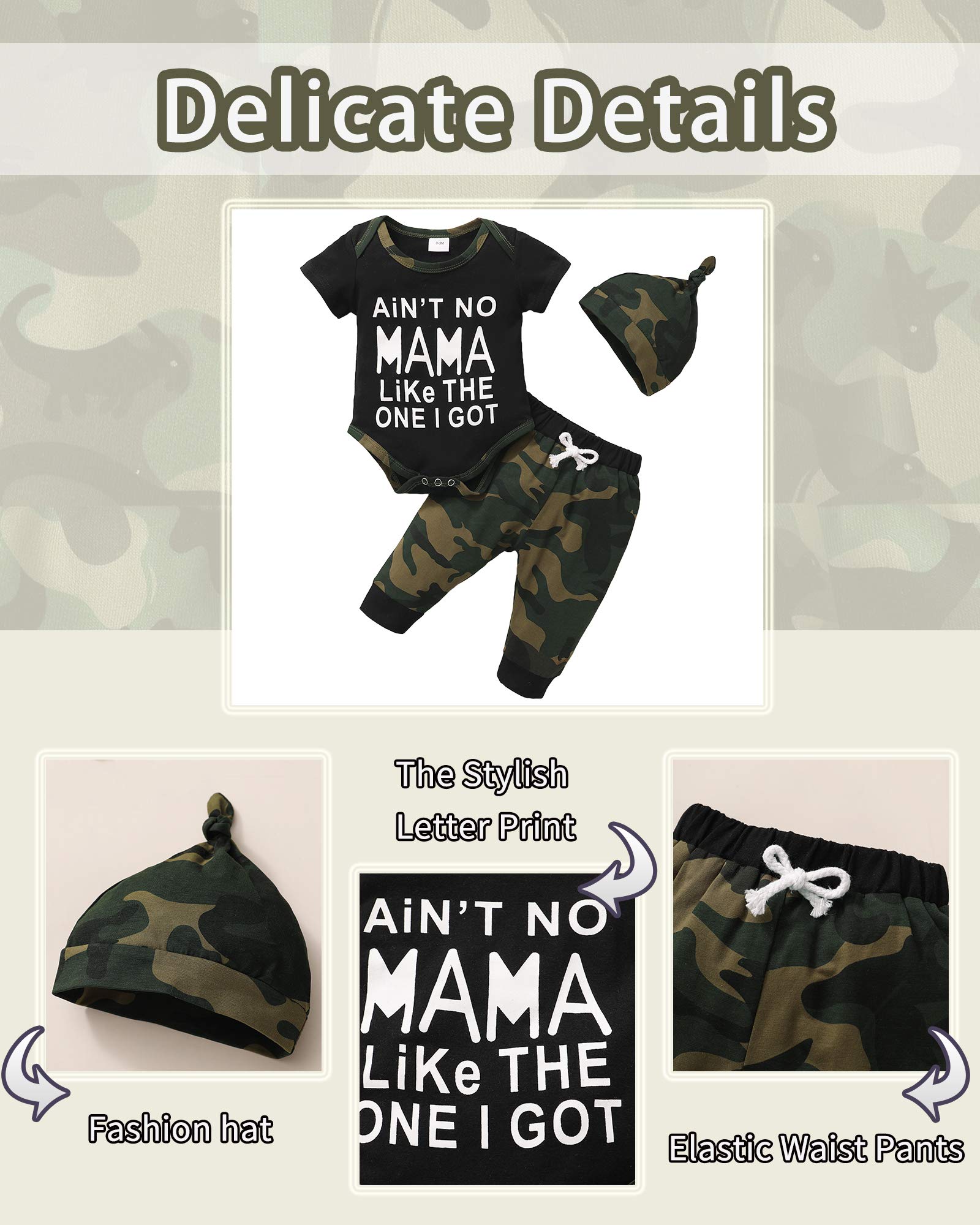 - Q: Does the NZRVAWS Baby Boy Clothes set have any special features? A: Yes, the romper top features a button opening for easy wear, while the camouflage pants have an elastic waistband for comfort and ease of movement.