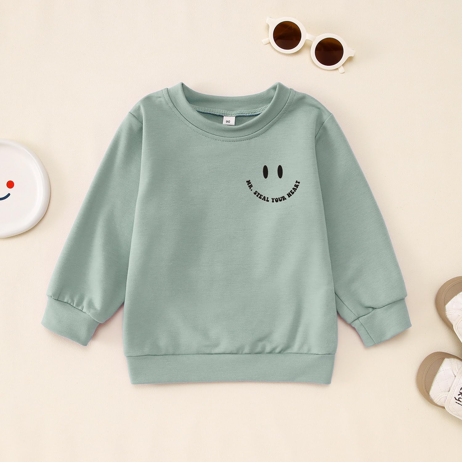 - Q: Does this sweatshirt have any unique design features? A: Yes, it features a smile letter graphic on the front and a 'Mr. Steal Your Heart' waved letter print on the back, along with a classic crew neck design.