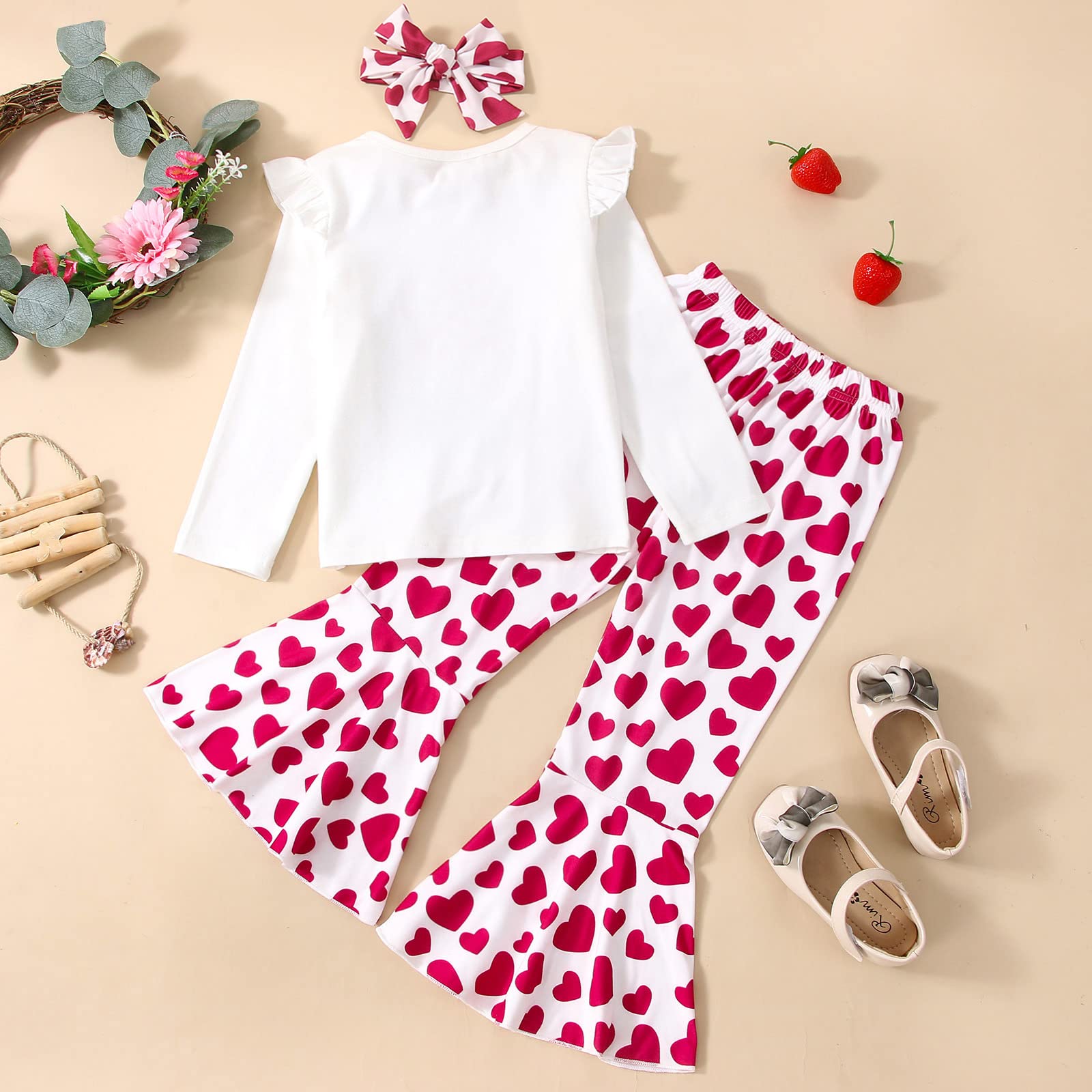 - Q: What is the design of the outfit? A: The outfit features a round neck, ruffle long sleeves, and a cute elephant heart print on the t-shirt, along with elastic waist heart print bell-bottom pants.