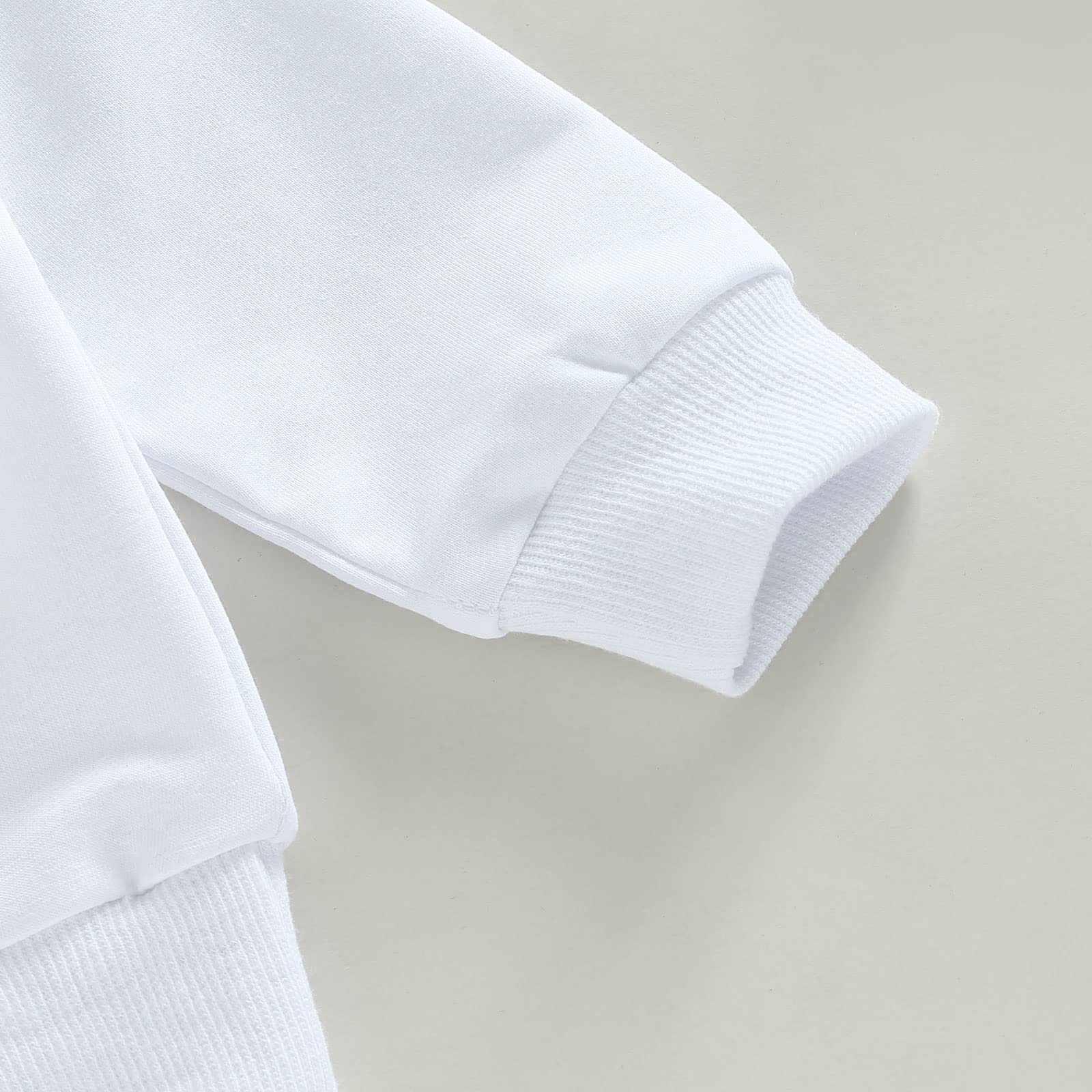 - Q: What design features does this outfit have? A: The outfit features a crew neck long sleeve sweatshirt with charming letter prints and a pair of pants with a drawstring elastic waist, styled for comfort and cuteness.