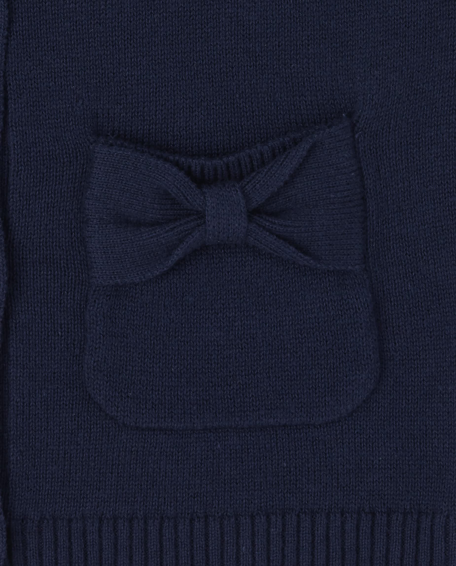 - Q: Does this cardigan have any special design elements? A: Yes, it features a cute bow-top patch pocket, adding a little flair to the classic crew neck design.