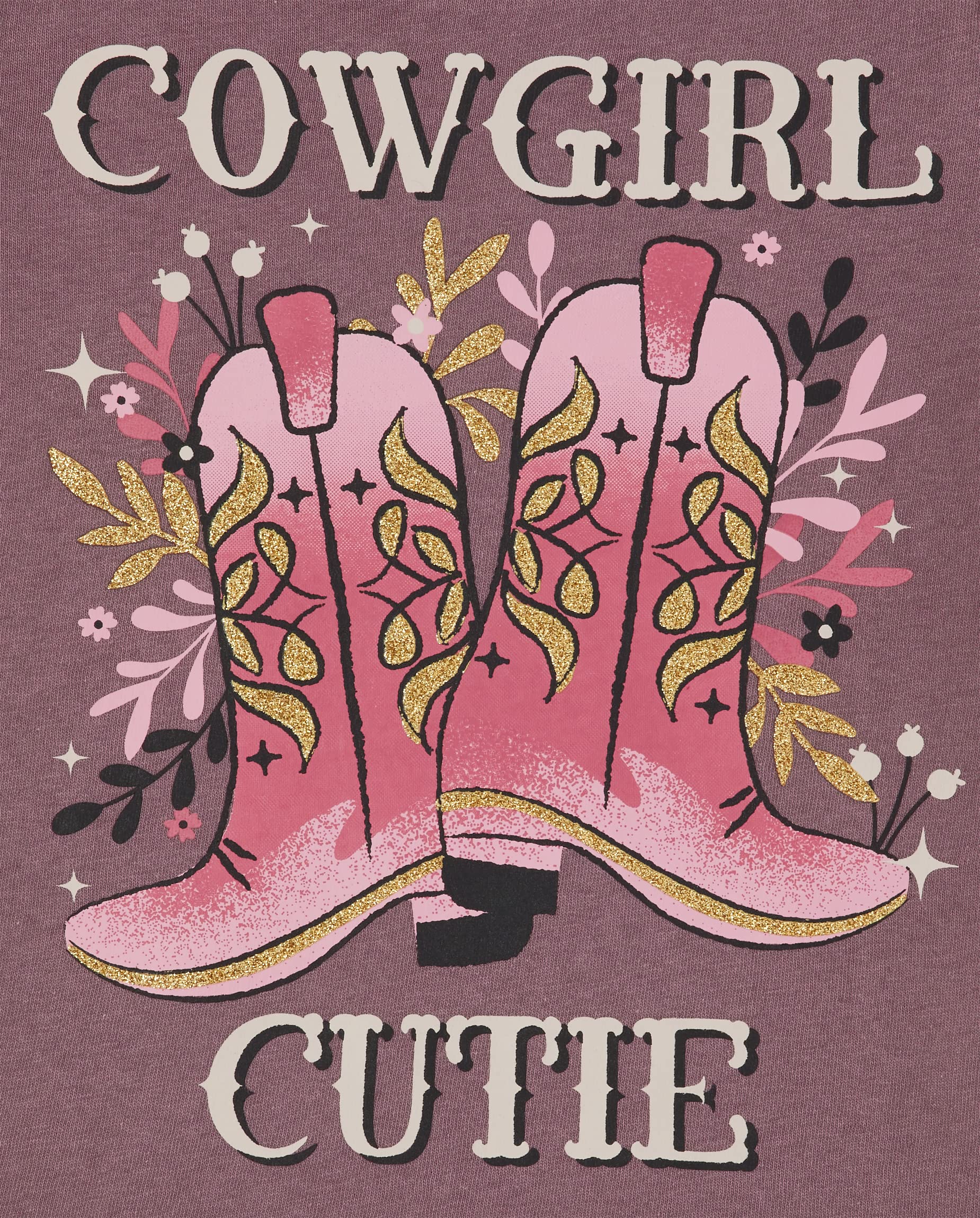 - Q: How many t-shirts are included in the pack? A: The pack includes two graphic t-shirts, one featuring 'Cowgirl Cutie' and cowgirl boots, and the other with a cowgirl and horse design.