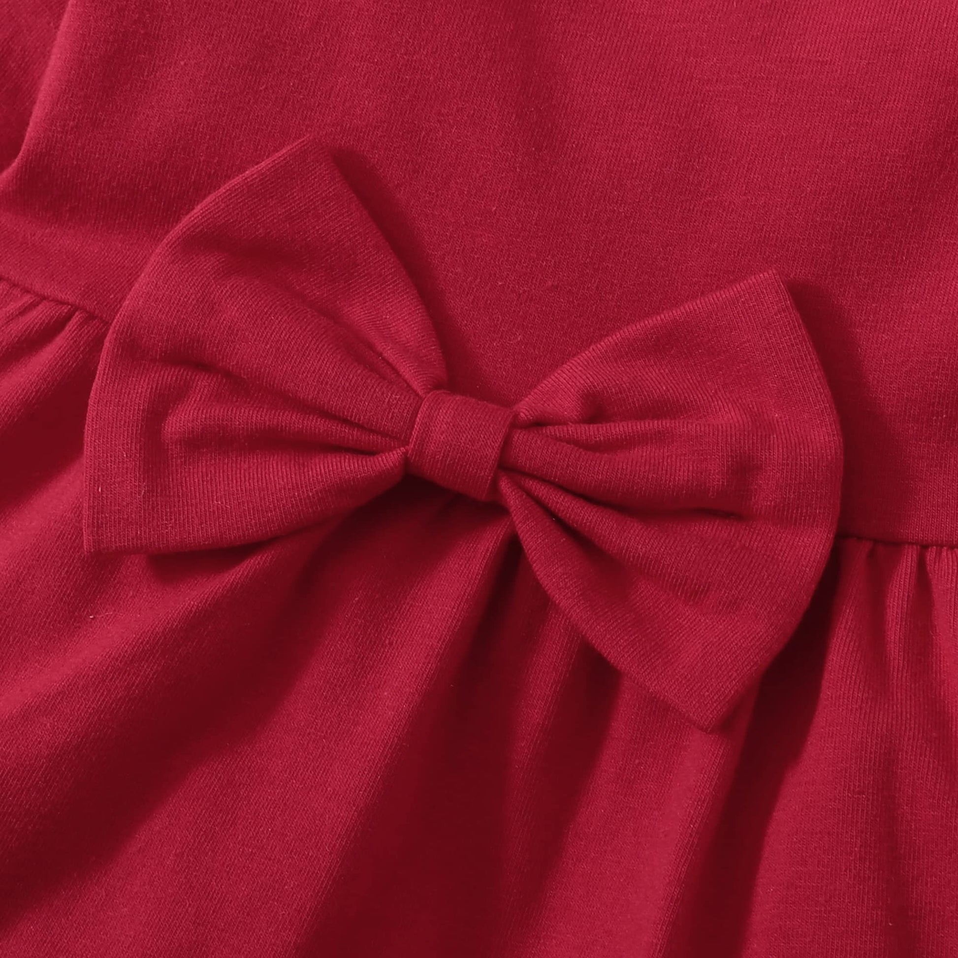 - Q: What style does this Christmas outfit feature? A: The outfit features a cute infant toddler design, with a ruffle long sleeve red shirt adorned with prints and a bowknot, complemented by stylish stripe pants.