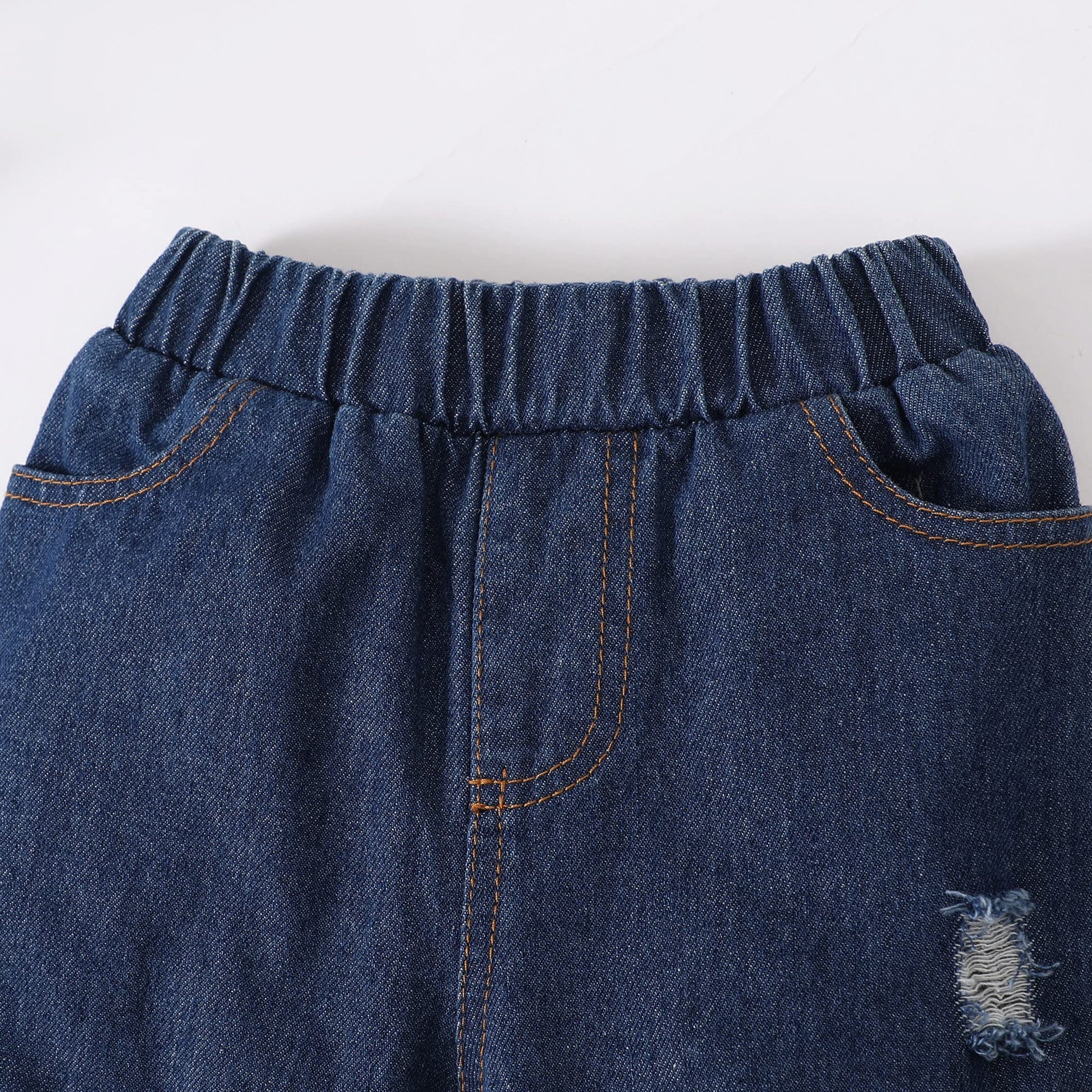 - Q: Are the jeans comfortable for active play? A: Yes, the ripped denim jeans are designed to be comfortable and allow freedom of movement, making them suitable for active toddlers.