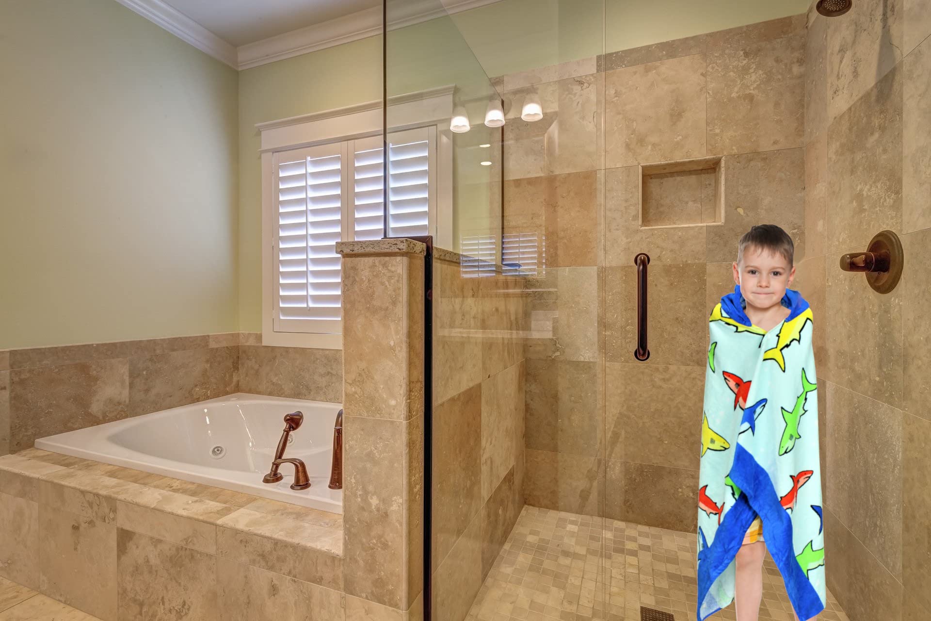 - Q: How does the towel help keep children warm? A: The high-quality terry inside is designed to absorb water quickly, helping to keep children warm and dry after swimming.