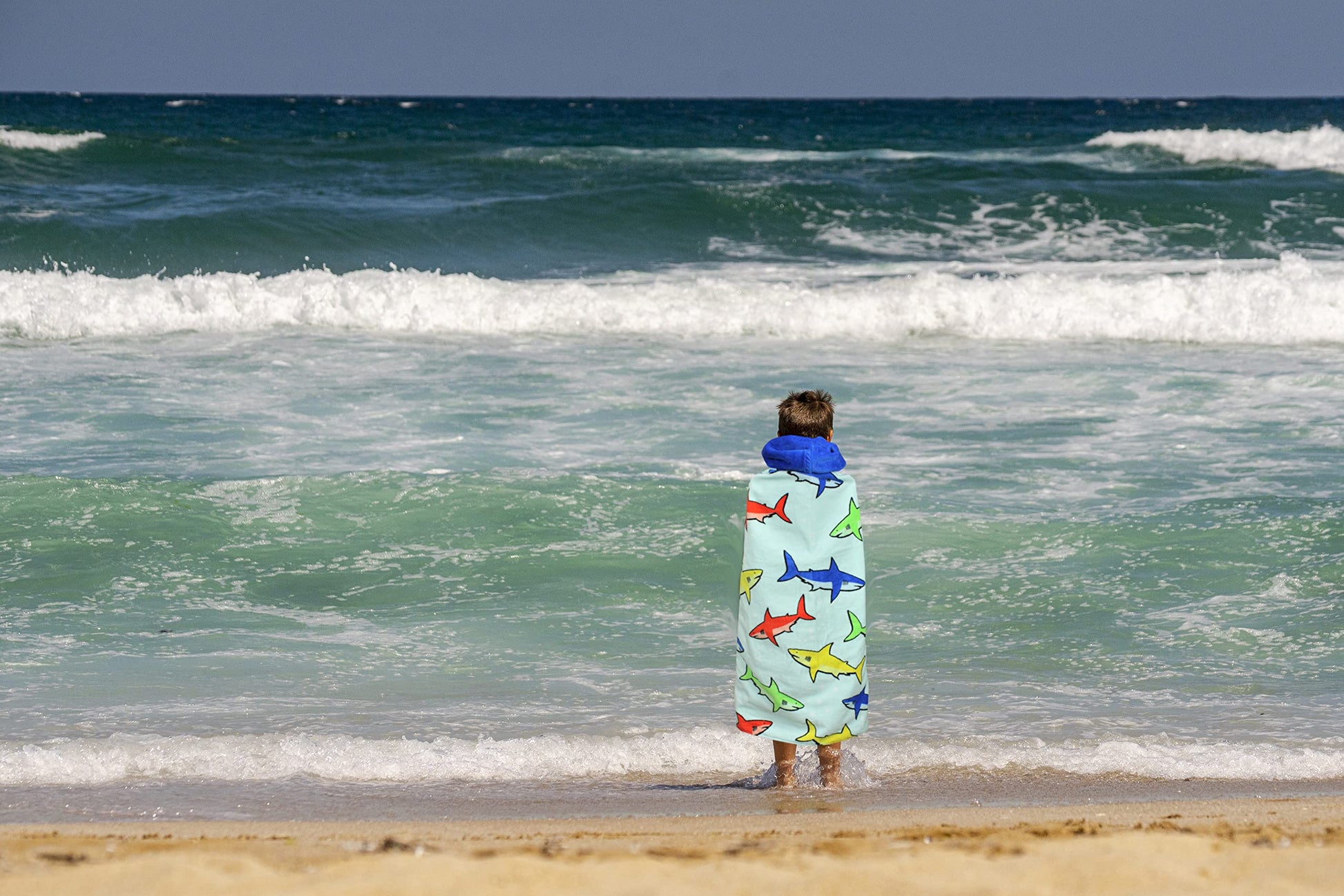 - Q: What design does the towel feature? A: The towel features a fun shark pattern that appeals to kids and parents alike.