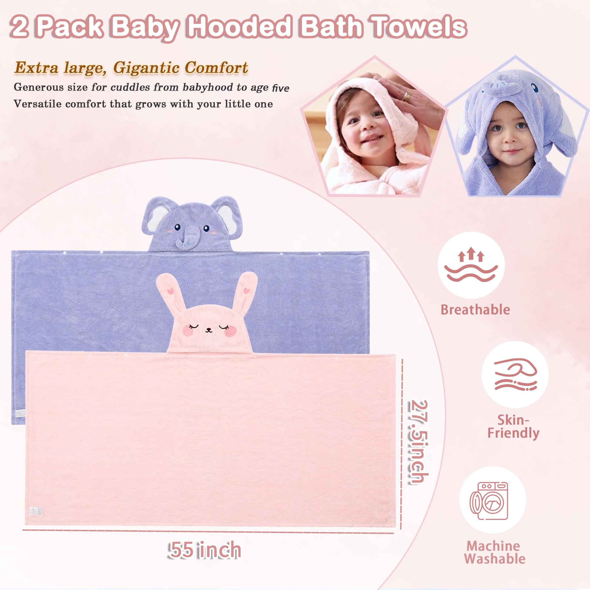 Foinemyed 2 Pack Toddler Towels With Hood Thick Toddler Towels 55' X 27.5' Baby Hooded Bath Towels Set For Girl Boy Super Abso