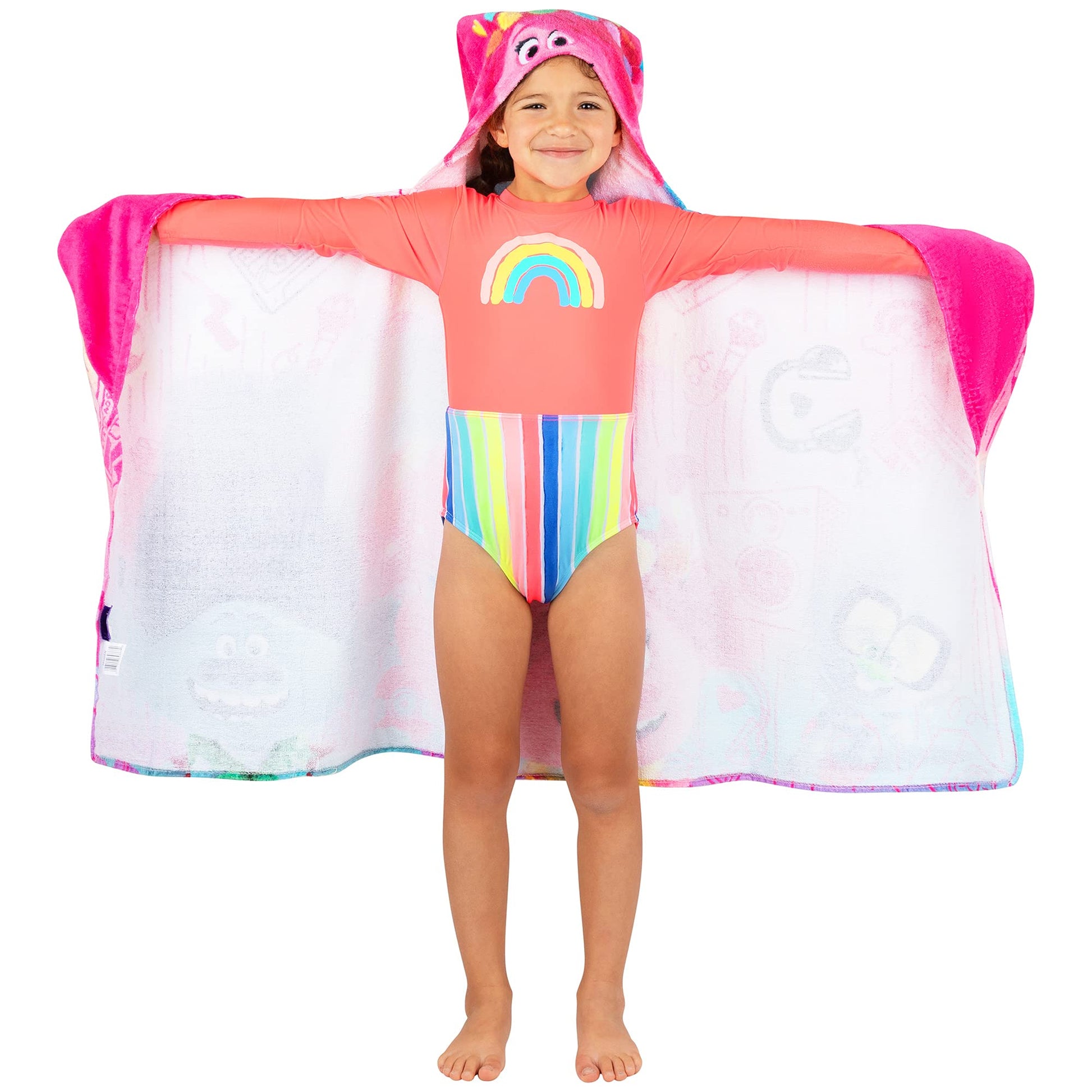 Add some musical movie magic to bath time and beach days with this soft and stylish Trolls World Tour hooded towel wrap. Featuring the colorful Poppy, Branch and Tiny Diamond characters from the hit DreamWorks film, this towel is a colorful companion for water-themed fun and adventure.Crafted from high-quality cotton terry fabric, this super soft hooded towel wrap delivers quick-drying absorbency. Trolls fans will love wrapping themselves up in the cool colors and vibrant artwork, featuring their favorite DreamWorks characters. Whether theyre toweling off at the pool, relaxing on the beach, or using this wrap as a poncho, bathrobe or washcloth, kids will get a kick out of the fun look and soft feel.In Trolls World Tour, Poppy and the gang work together to unite the six troll tribes through music. Now fans can join in on the fun with a colorful, high quality hooded towel wrap that reflects the cheerful charm and inspiring messages of the Dreamworks animated feature.